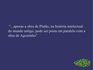 O documento discute a vida e obra de Santo Agostinho, com foco na questão do tempo. Agostinho foi levado a refletir sobre o tempo após questionamentos sobre "o que Deus fazia antes da criação". Suas intuições sobre o tempo são consideradas geniais. Agostinho conclui que o tempo teve início e não é eterno, pois só Deus é eterno, tendo criado o tempo e todas as coisas.