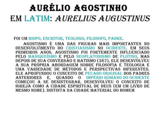 Santo Agostinho foi um importante bispo, escritor, teólogo e filósofo cristão do século IV e V d.C. que influenciou profundamente o desenvolvimento do cristianismo ocidental. Ele aprofundou os conceitos de pecado original e da Igreja como a cidade espiritual de Deus, distinta da cidade material do homem. Seu pensamento influenciou a visão medieval do homem e a Igreja se identificou com seu conceito de "Cidade de Deus".