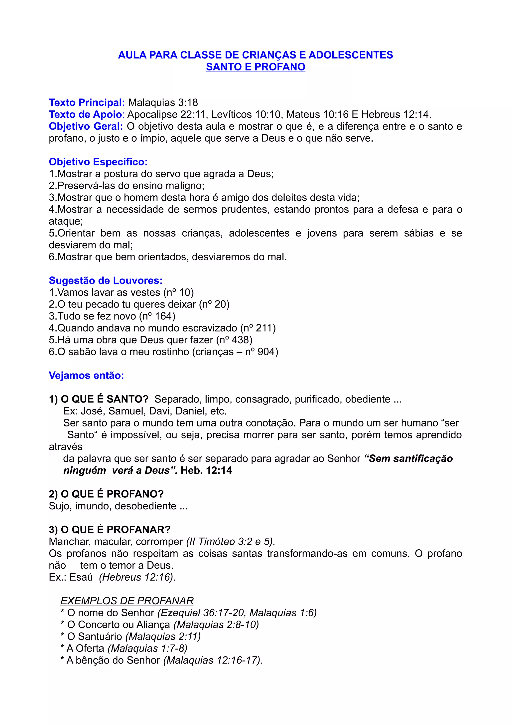 1) O documento apresenta uma aula sobre a diferença entre o santo e o profano, objetivando mostrar a postura do servo de Deus versus aquele que não o serve.