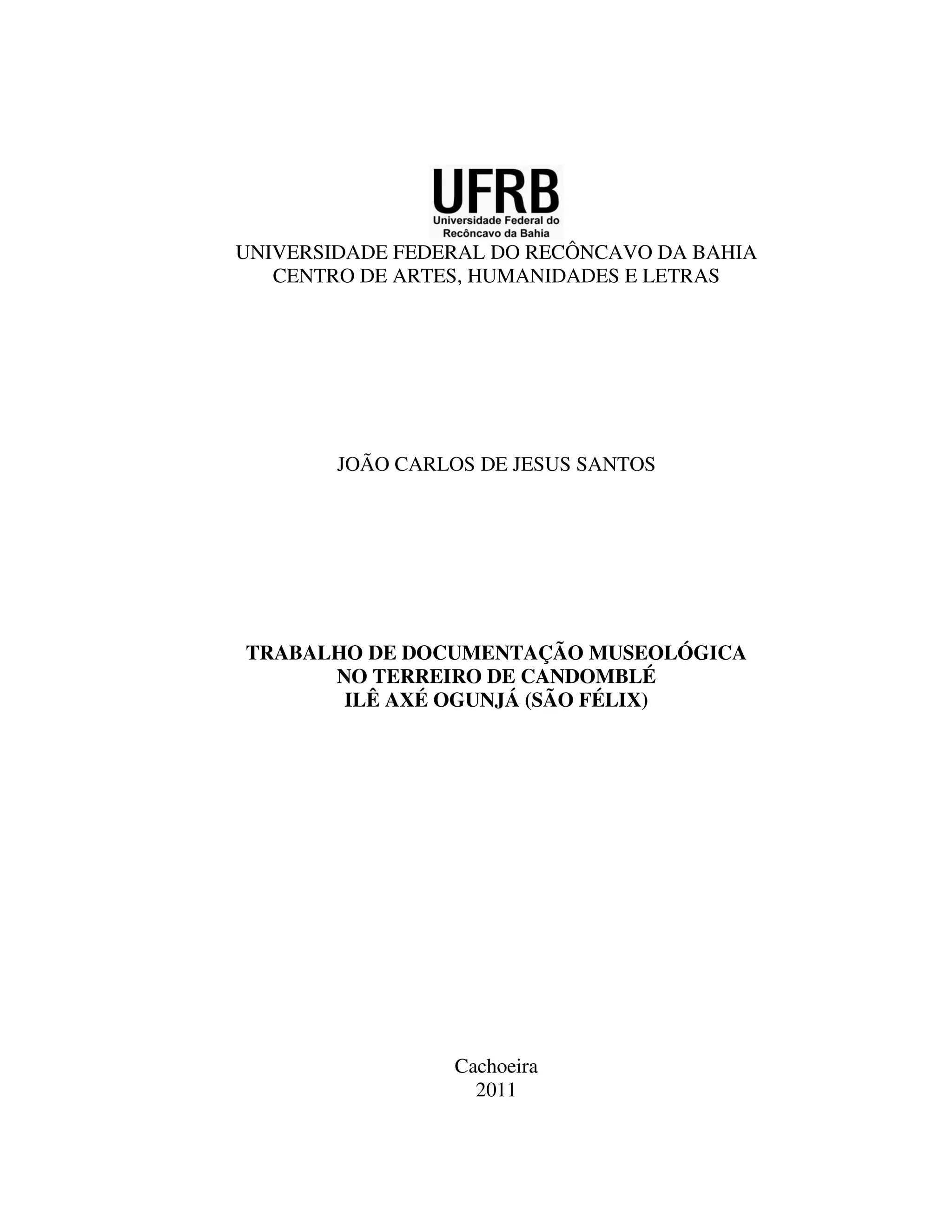 Este trabalho apresenta a documentação do terreiro de candomblé Ilê Axé Ogunjá, localizado em São Félix, Bahia. A pesquisa utilizou métodos bibliográfico e etnográfico, com observações, entrevistas e fotografias, para reunir dados sobre o terreiro. O trabalho descreve a origem e arquitetura do terreiro, realiza um inventário dos objetos de culto e documenta as festas de Oxossi e Ogum, contribuindo para o reconhecimento deste espaço como patrimônio cultural imaterial