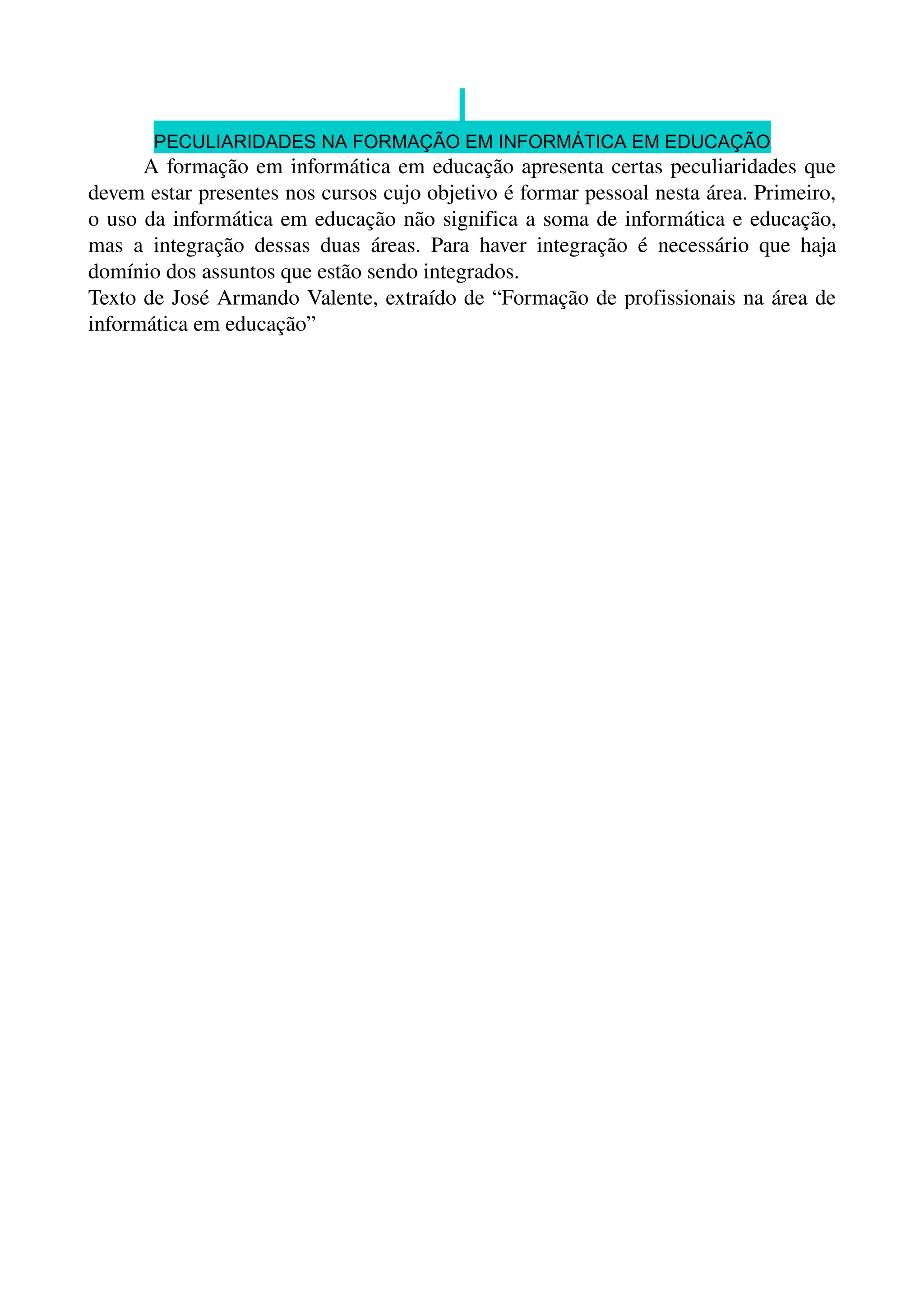 A formação em informática em educação requer: 1) A integração da informática e educação, não apenas a soma das duas áreas; 2) Domínio dos assuntos de informática e educação para que haja integração; 3) Cursos devem ter características específicas para formar profissionais nesta área.