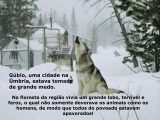 Uma cidade na Itália vivia em medo constante de um grande lobo feroz. Quando São Francisco chegou, ele ofereceu-se para enfrentar o lobo desarmado, com compaixão. O lobo se aproximou raivoso, mas Francisco falou com ele com amor, e o lobo se acalmou e prometeu não atacar mais.