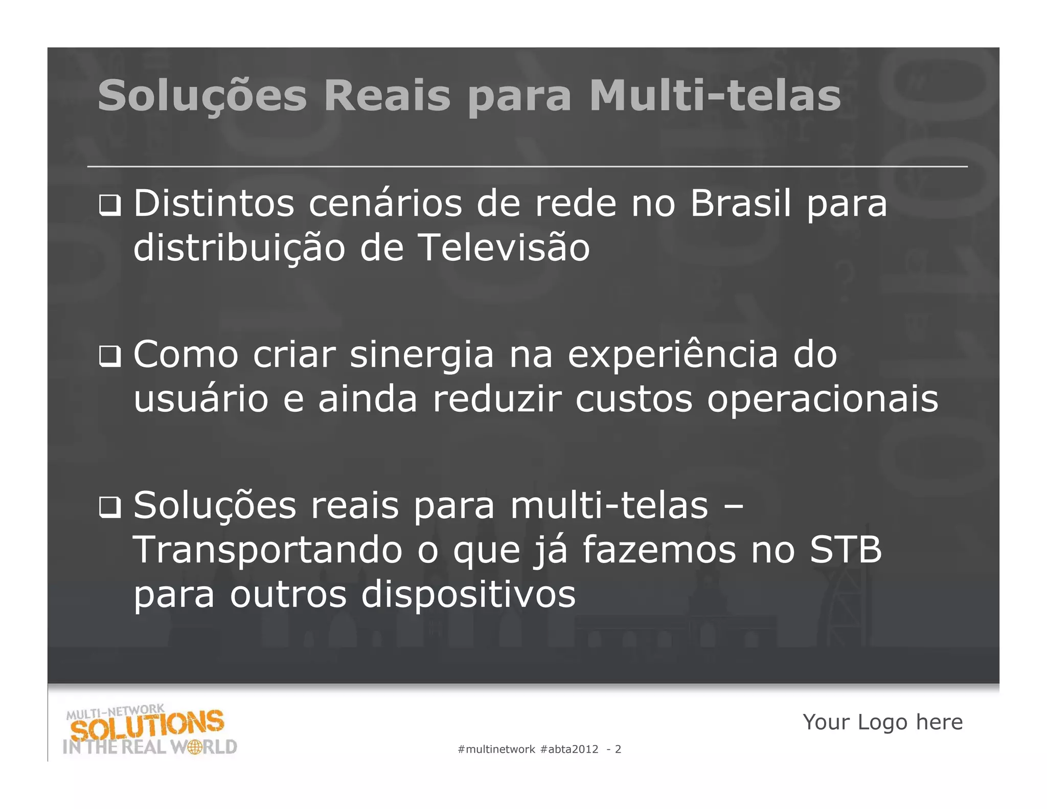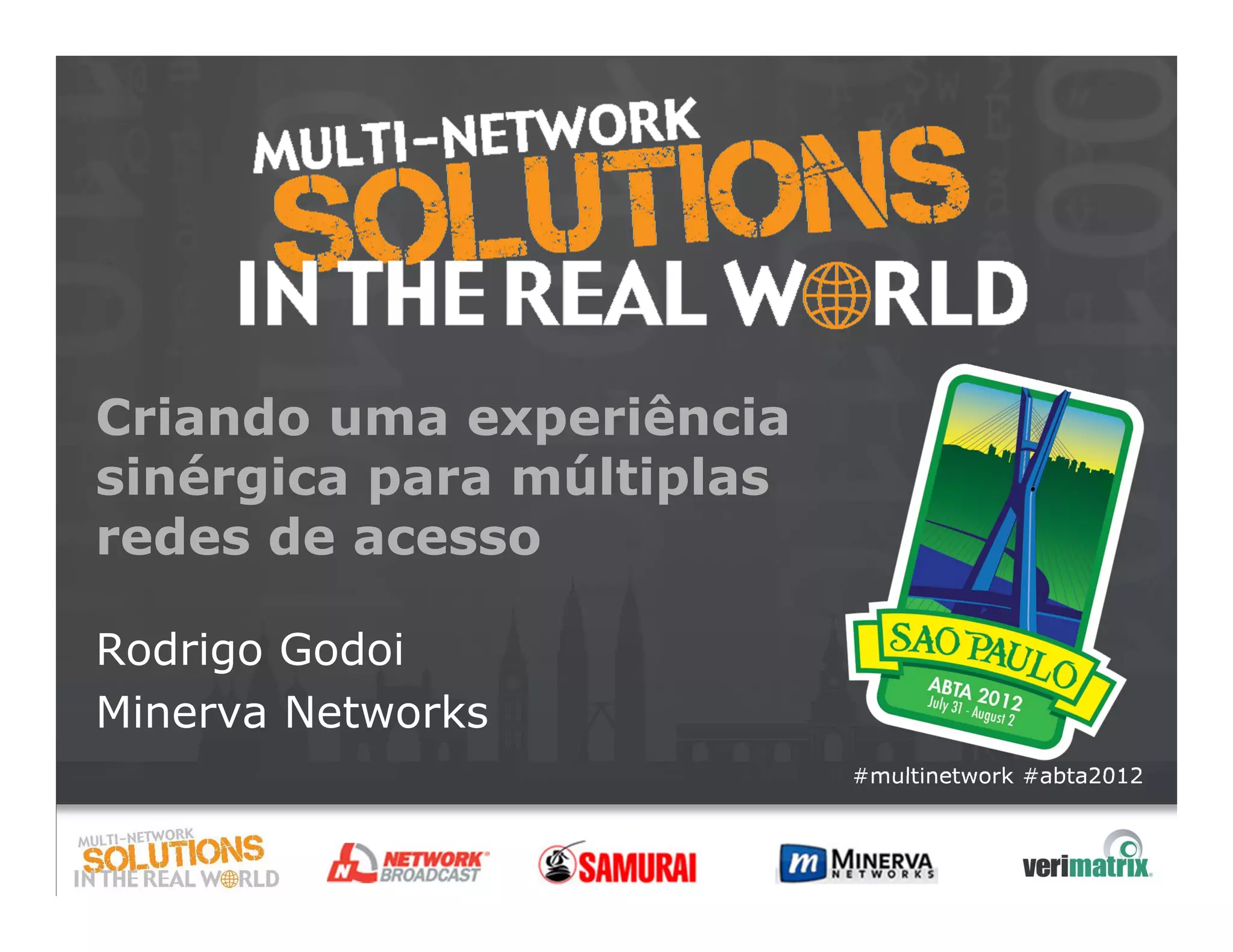 O documento discute como criar uma experiência sinérgica para usuários em múltiplas redes de acesso, propondo uma solução centralizada para gerenciar planos de serviço, dispositivos e usuários de forma homogênea, permitindo acesso aos mesmos serviços em TV, smartphones, tablets e PCs, além de apresentar casos reais de redes híbridas no Brasil.