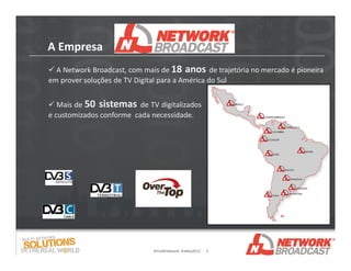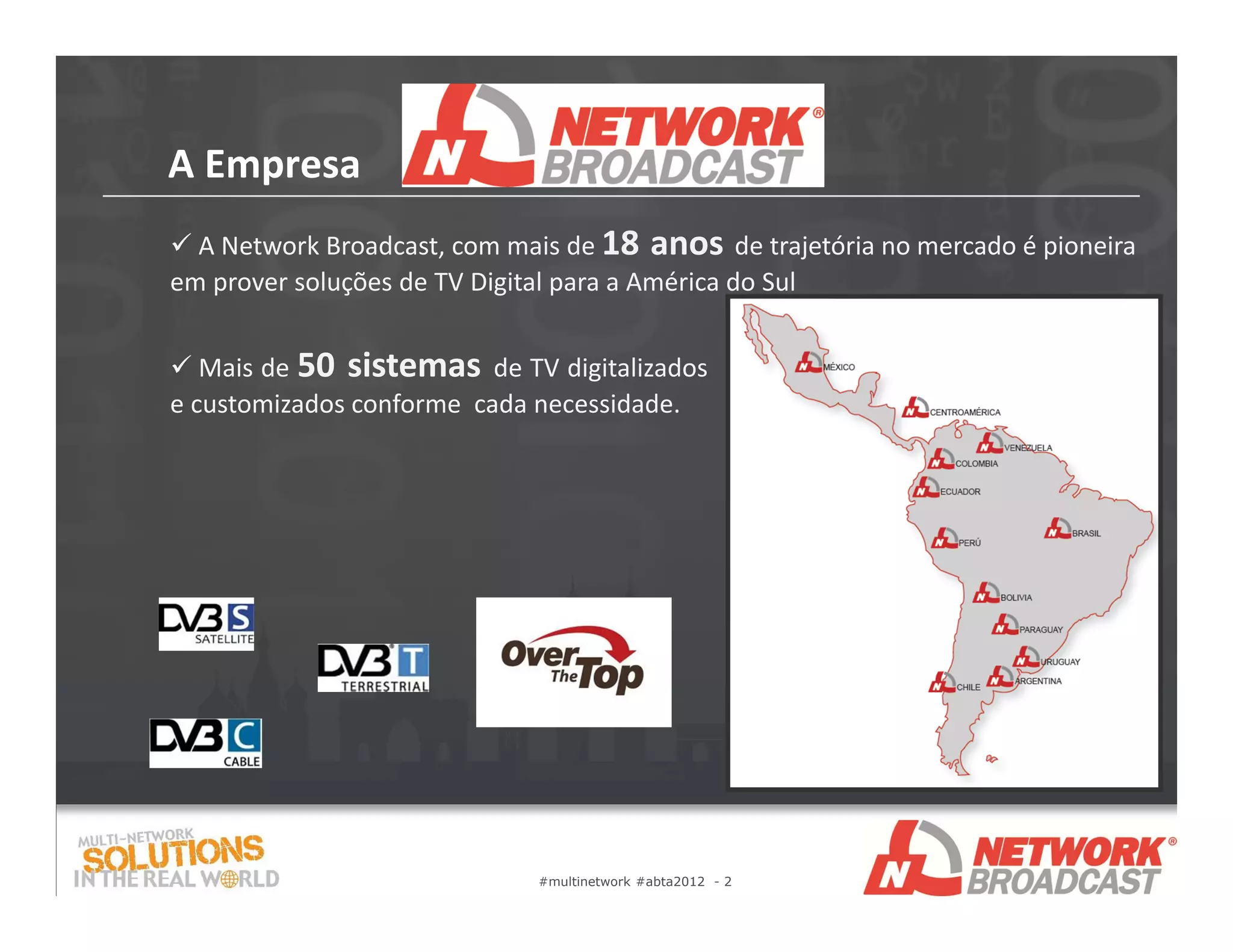 A Network Broadcast é uma empresa pioneira em soluções de TV digital na América do Sul com mais de 18 anos de experiência. Eles fornecem soluções completas de ponta a ponta, incluindo análise, desenvolvimento, implementação e suporte para mais de 50 sistemas digitalizados customizados. Os serviços incluem head ends, set-top boxes, smart cards e suporte 24 horas por dia.