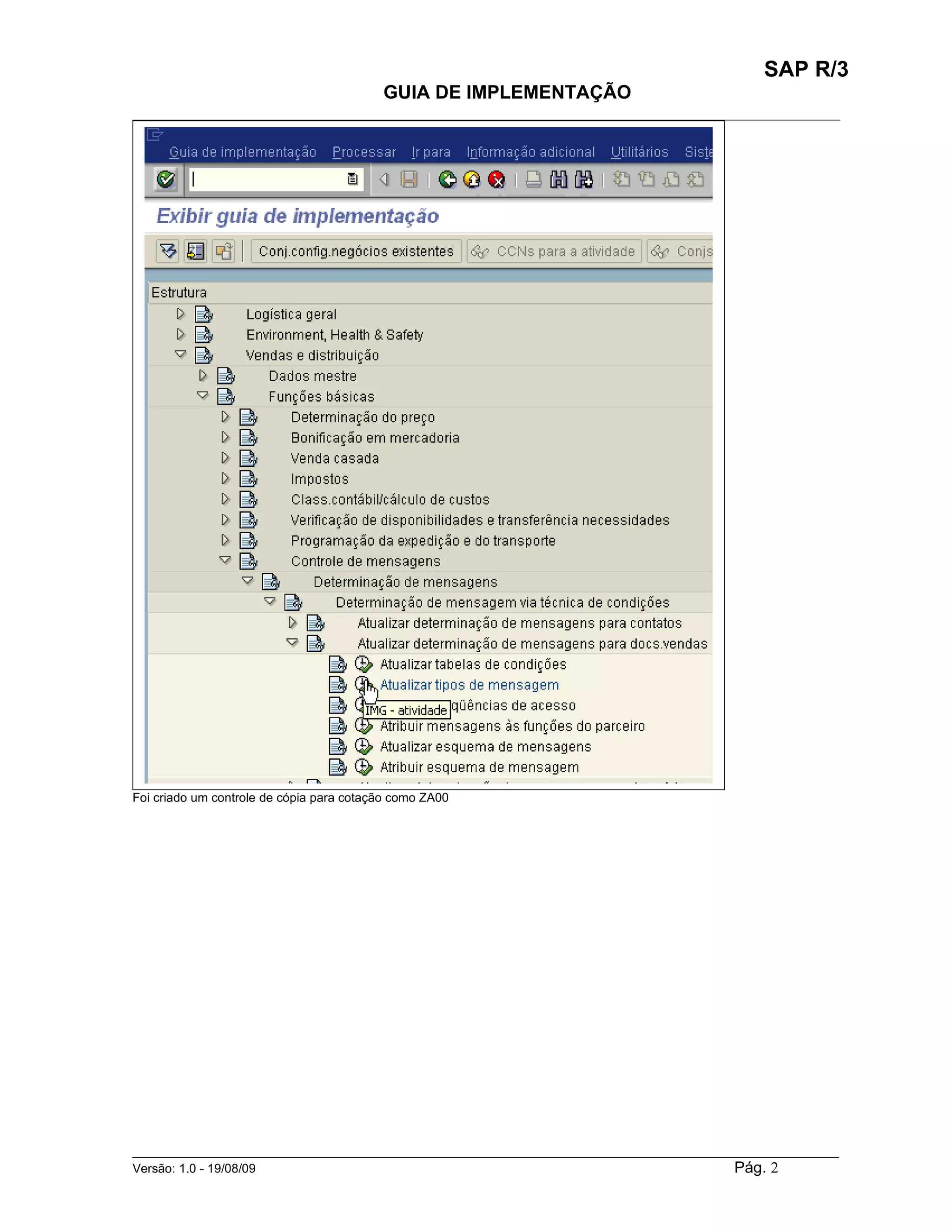 O documento fornece instruções sobre como implementar mensagens de saída (output messages) no processo de vendas do SAP. Explica como definir condições de mensagens, tipos de mensagem, esquemas de mensagem e registros de condição, além de fornecer um exemplo de programa e dicas para debugar programas de output message no faturamento de vendas.