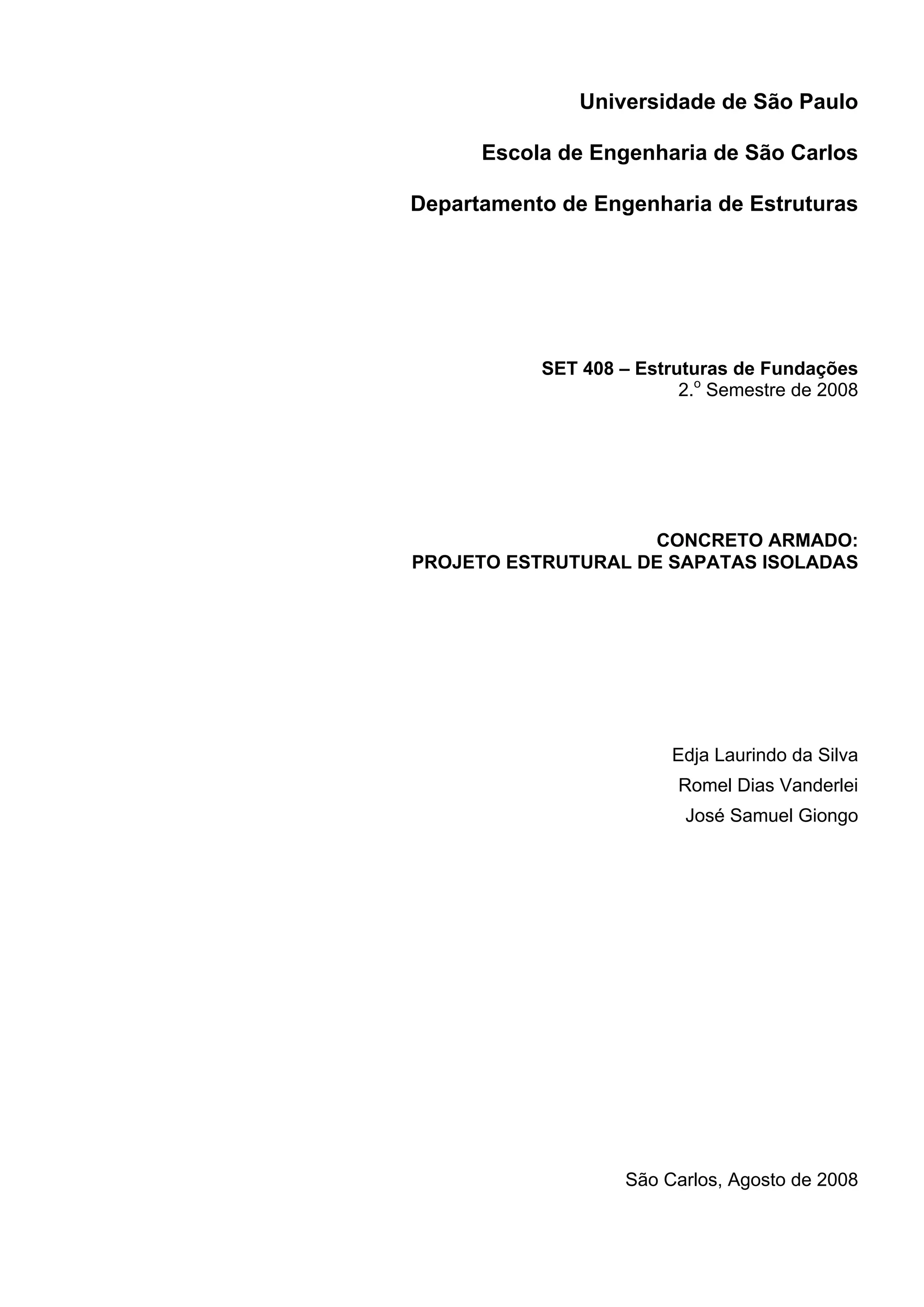 Este documento apresenta conceitos sobre projeto estrutural de sapatas isoladas em concreto armado. No capítulo 1, discute-se tipos de fundações rasas como sapatas isoladas, associadas, corridas e radeiras. Explica-se a influência da rigidez da sapata no projeto e dimensionamento. Nos capítulos subsequentes, abordam-se modelos para determinação dos esforços resistentes em sapatas e exemplos de projeto para diferentes configurações de carga.