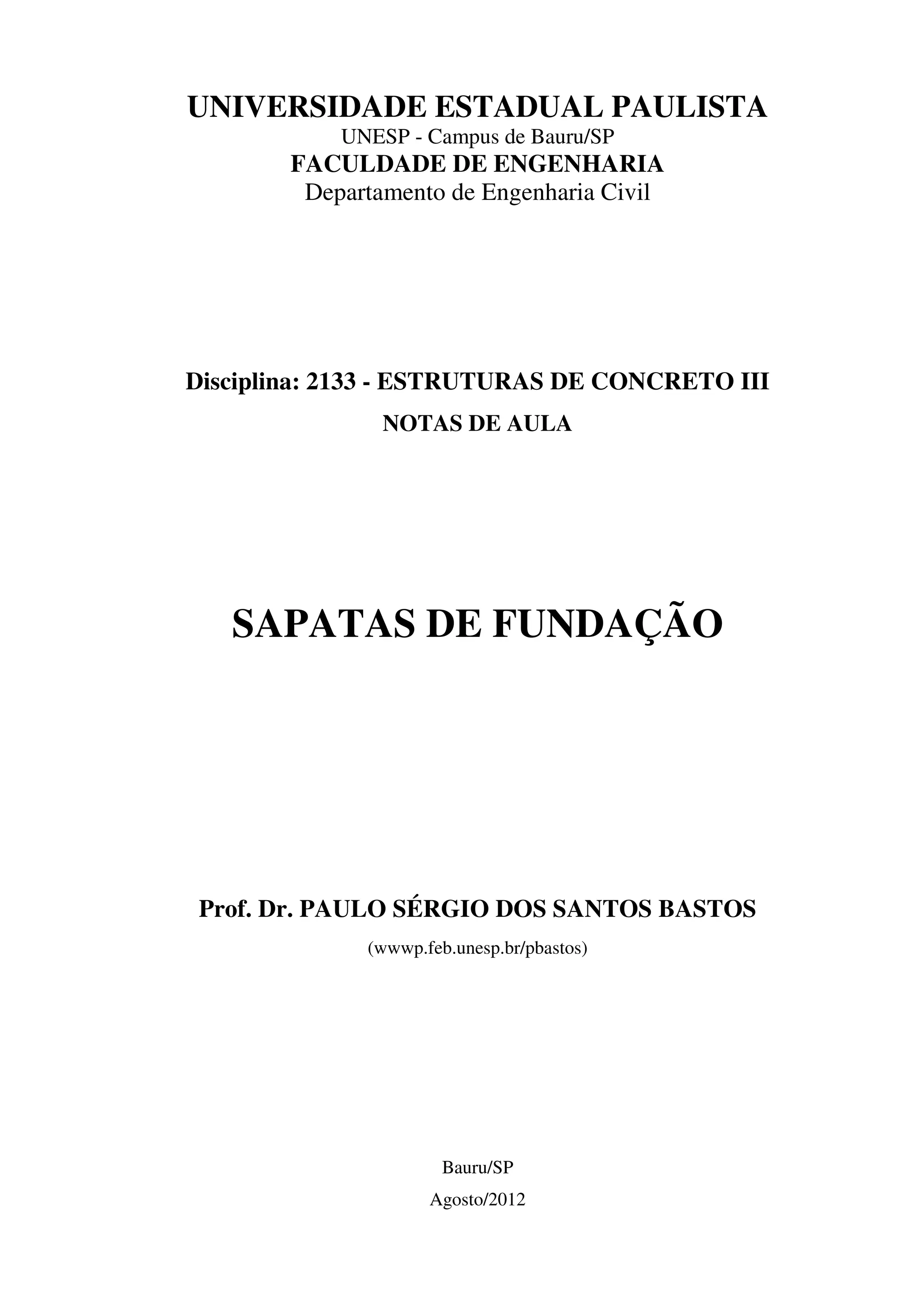 Este documento apresenta notas de aula sobre dimensionamento de sapatas de fundação de acordo com a NBR 6118/2003. Discute definições de fundação superficial e sapata de fundação, tipos de sapatas como isoladas, corridas e associadas. Apresenta métodos para dimensionar sapatas isoladas sob cargas centradas ou excêntricas, considerando rigidez, momentos fletores, força cortante e punção. Discutem-se também sapatas corridas e associadas, além de sapatas em divisas com vigas de equilíbrio.