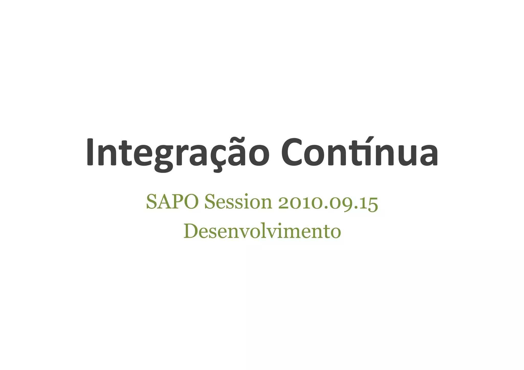 O documento discute a integração contínua e as ferramentas para implementá-la. Resume que a integração contínua automatiza o processo de desenvolvimento através de commits frequentes, builds e testes automatizados para reduzir riscos e aumentar a qualidade do código.