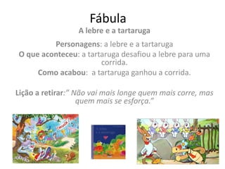 A lebre desafiou a tartaruga para uma corrida, confiante em sua velocidade, mas se distraiu durante o percurso enquanto a tartaruga se esforçou continuamente, resultando na tartaruga vencendo a corrida e ensinando que o esforço é mais importante do que a velocidade.