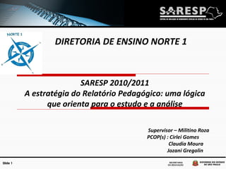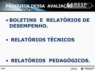 Este documento discute o Relatório Pedagógico da SARESP 2010/2011. Ele destaca que os objetivos são verificar o progresso dos alunos, identificar pontos fortes e fracos, e definir políticas públicas para a educação básica. O documento também descreve a metodologia da avaliação, que inclui testes comparativos, questionários sobre o contexto e gestão escolar, e itens baseados nos currículos de São Paulo e no SAEB.