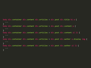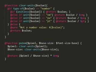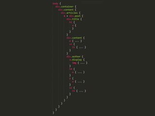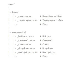 O documento discute o uso de pré-processadores CSS como Sass para tornar o código CSS mais organizado, reutilizável e escalável. Ele explica como Sass oferece recursos como variáveis, aninhamento, mixins, herança de seletores e funções que melhoram a manutenção e a velocidade de desenvolvimento. O documento também discute boas práticas de estruturação de arquivos e código com Sass.