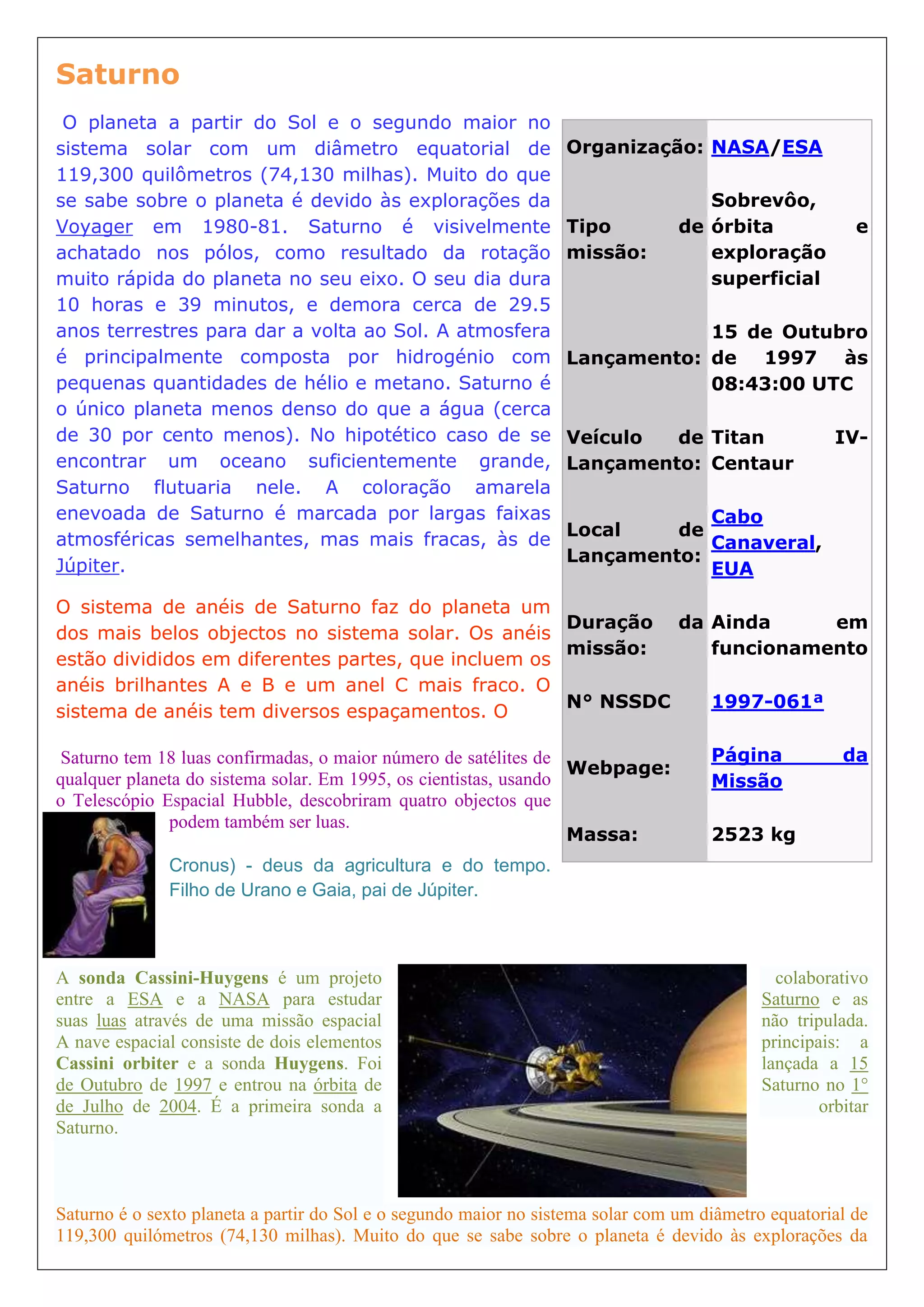 A sonda Cassini-Huygens, uma missão conjunta entre a ESA e a NASA, estudou Saturno e suas luas a partir de 2004. Saturno é o segundo maior planeta do sistema solar, com um diâmetro de 119.300 km. Sua atmosfera é composta principalmente de hidrogênio e hélio, e ele é o único planeta menos denso que a água. Saturno possui anéis proeminentes e 18 luas confirmadas.