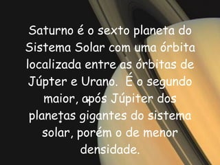 Saturno é o sexto planeta do Sistema Solar, entre Júpiter e Urano, e o segundo maior, após Júpiter. Seu aspecto mais característico é seu brilhante sistema de anéis, o único visível da Terra. É um planeta gasoso composto principalmente de hidrogênio e hélio.