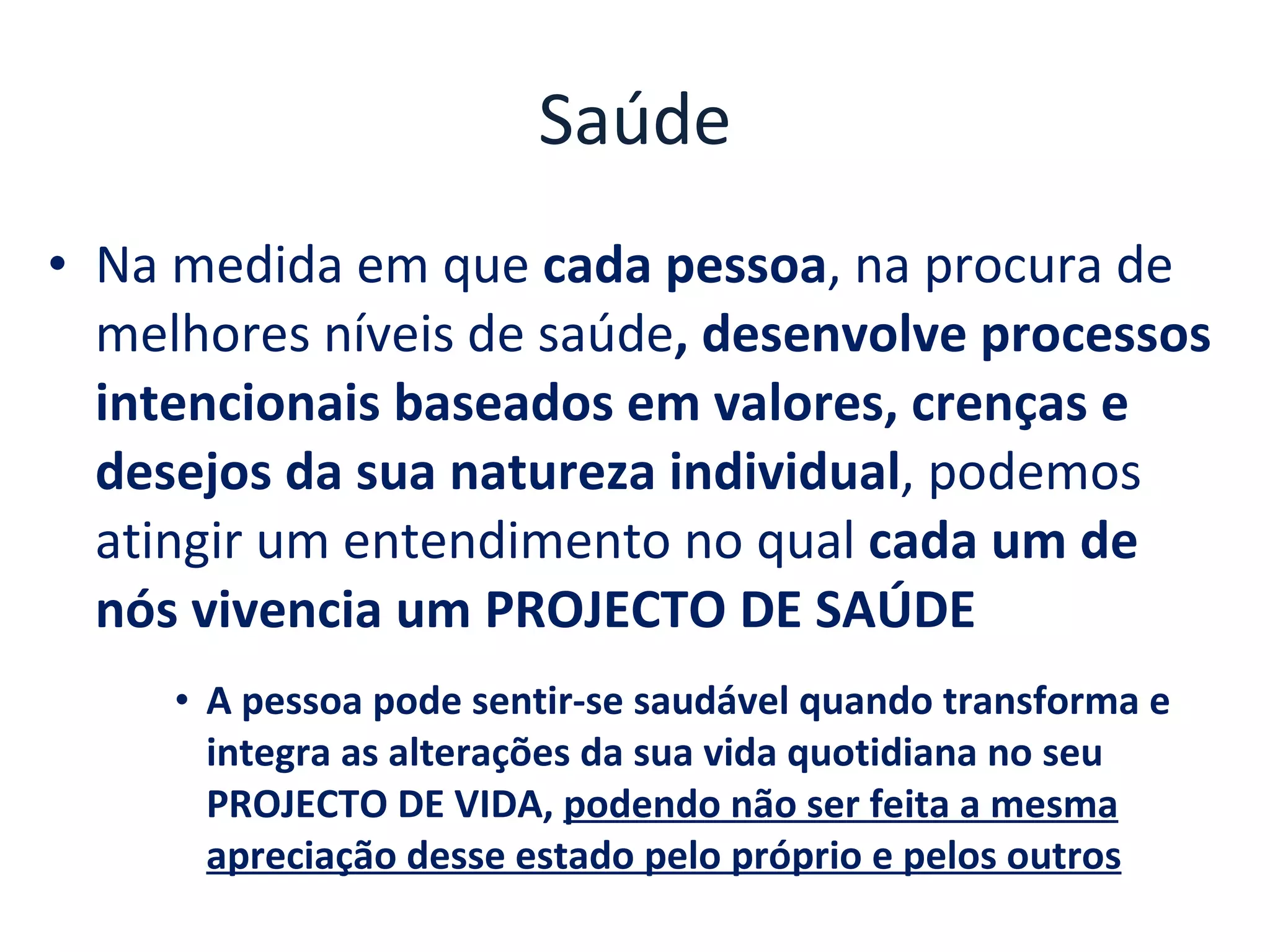 Este documento discute a promoção da saúde e comportamentos de saúde versus comportamentos de risco. Ele define saúde como a capacidade de cada pessoa lutar pelo seu próprio projeto de vida em direção ao seu bem-estar. Também enfatiza que cada indivíduo deve assumir responsabilidade por sua própria saúde e desenvolver habilidades para construir um projeto de vida equilibrado.