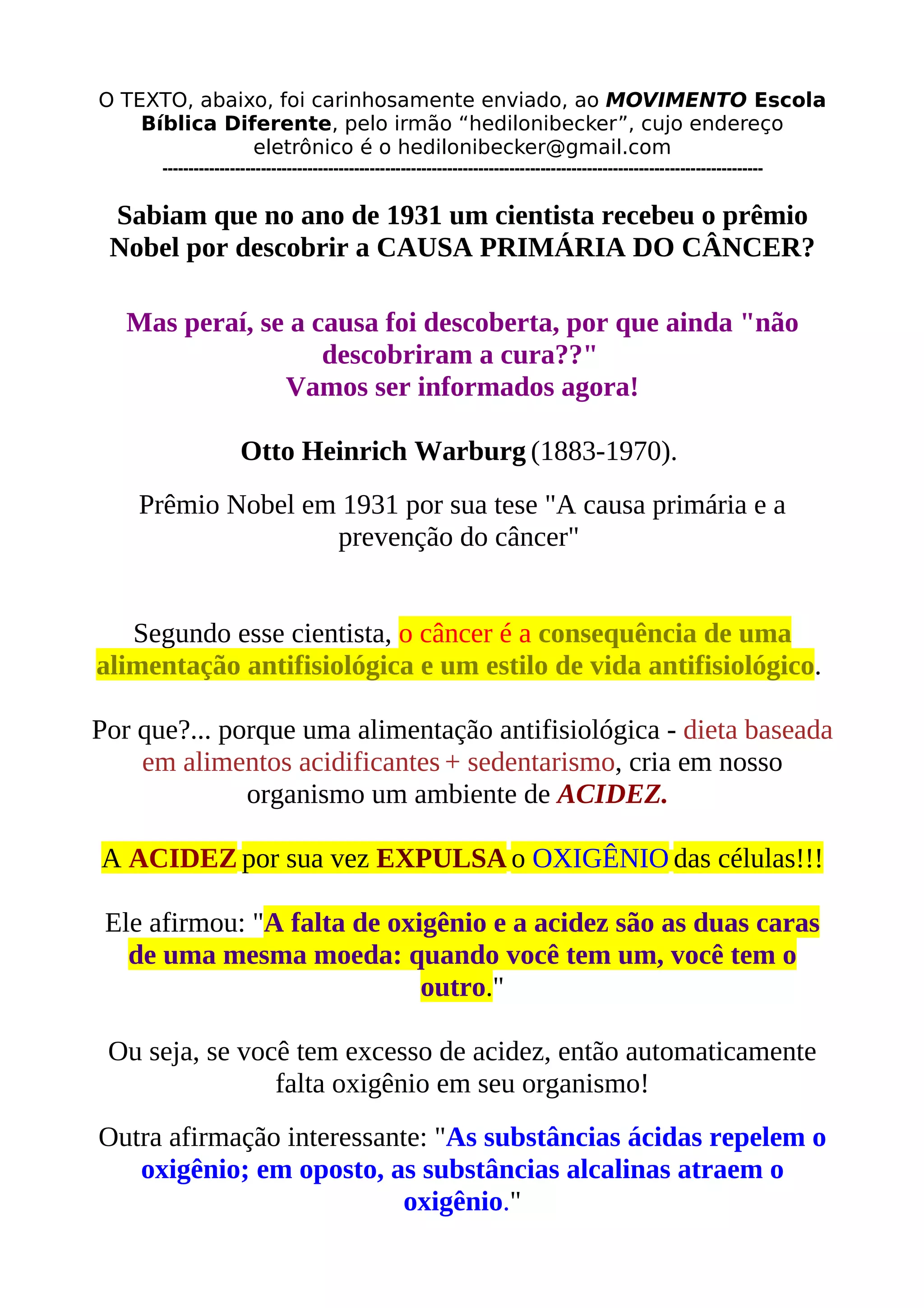 O documento discute a descoberta de Otto Warburg em 1931 de que a causa primária do câncer é um ambiente ácido e sem oxigênio nas células, devido a uma alimentação e estilo de vida antifisiológicos. Warburg recebeu o Prêmio Nobel por esta descoberta. O documento lista alimentos que acidificam e alcalinizam o corpo, argumentando que manter o corpo alcalino previne o câncer.