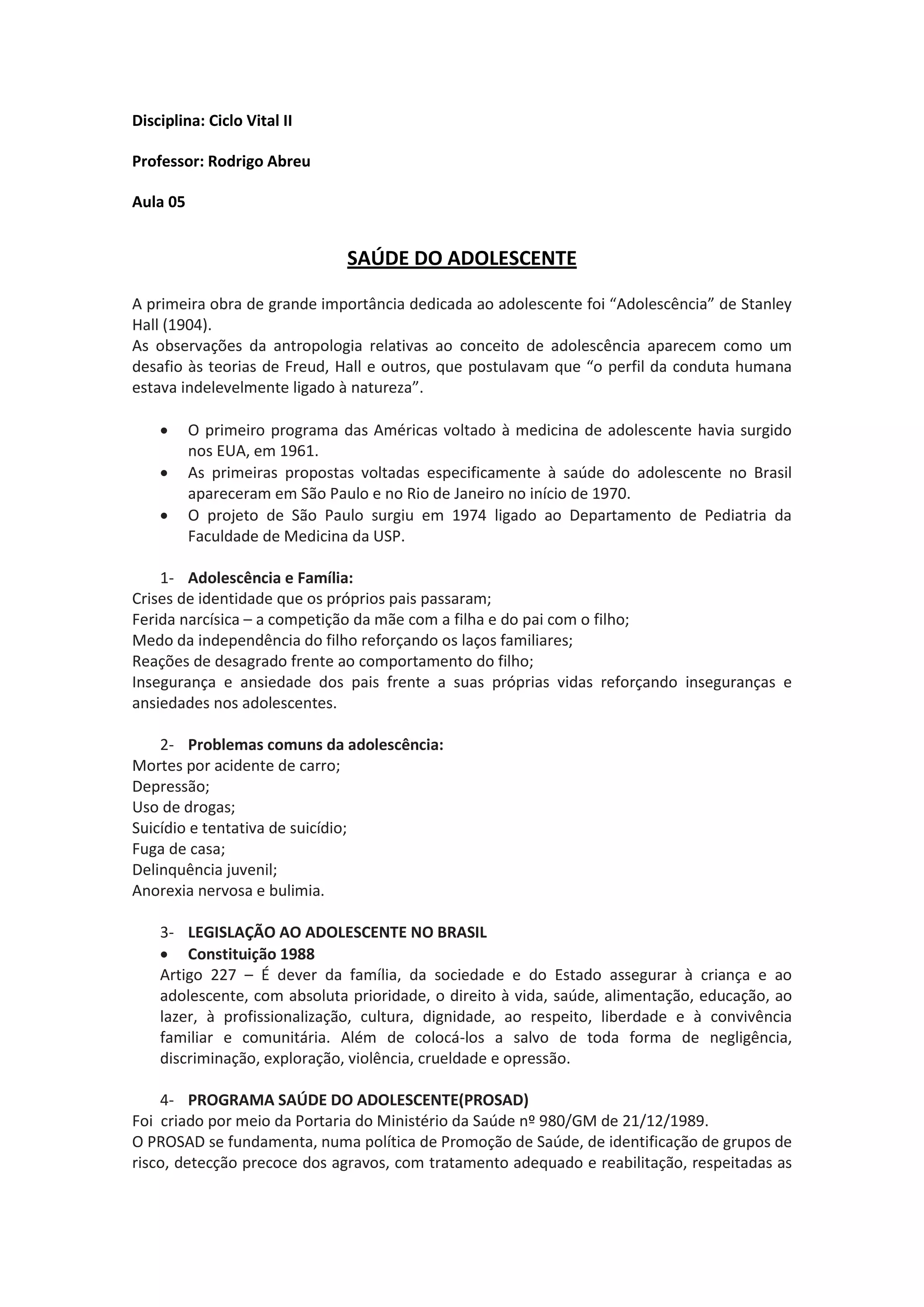 O documento discute a saúde do adolescente, abordando: 1) a primeira obra importante sobre adolescência de Stanley Hall em 1904; 2) os primeiros programas de saúde do adolescente no Brasil surgindo em 1970 em São Paulo e Rio de Janeiro; 3) questões comuns na adolescência como mortes por acidente, depressão e uso de drogas.