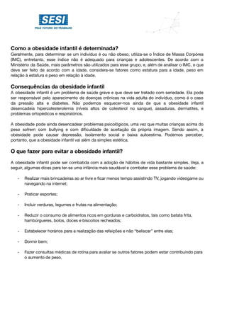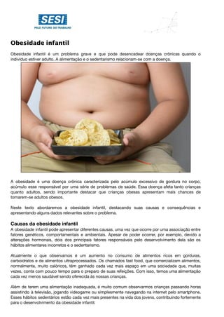 A obesidade infantil é causada principalmente por hábitos alimentares inadequados e sedentarismo, podendo desencadear doenças crônicas futuramente. Ela afeta cerca de 13% das crianças brasileiras e está aumentando globalmente, sendo importante adotar estilos de vida mais saudáveis.