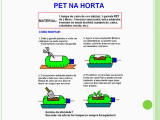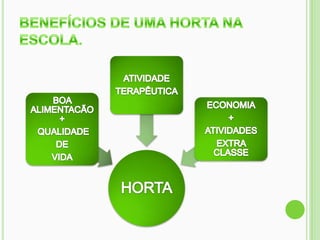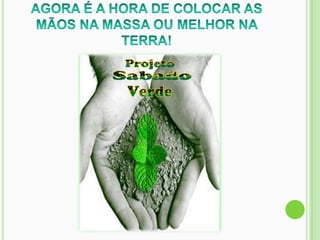 O documento descreve as atividades de um Sábado Verde para a construção de uma horta escolar. Os alunos serão divididos em grupos para limpar o terreno, construir canteiros, plantar mudas e cuidar da horta. As atividades ocorrerão das 10h às 12h, com café da manhã às 9h e almoço às 12h30.