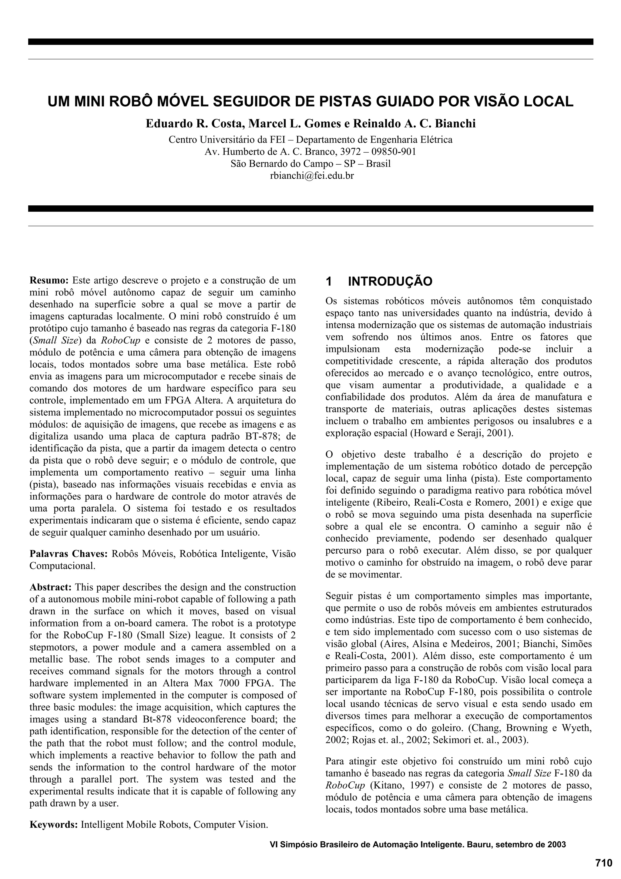 1) O documento descreve o projeto e construção de um mini robô móvel capaz de seguir uma pista desenhada na superfície com base em imagens de uma câmera local.