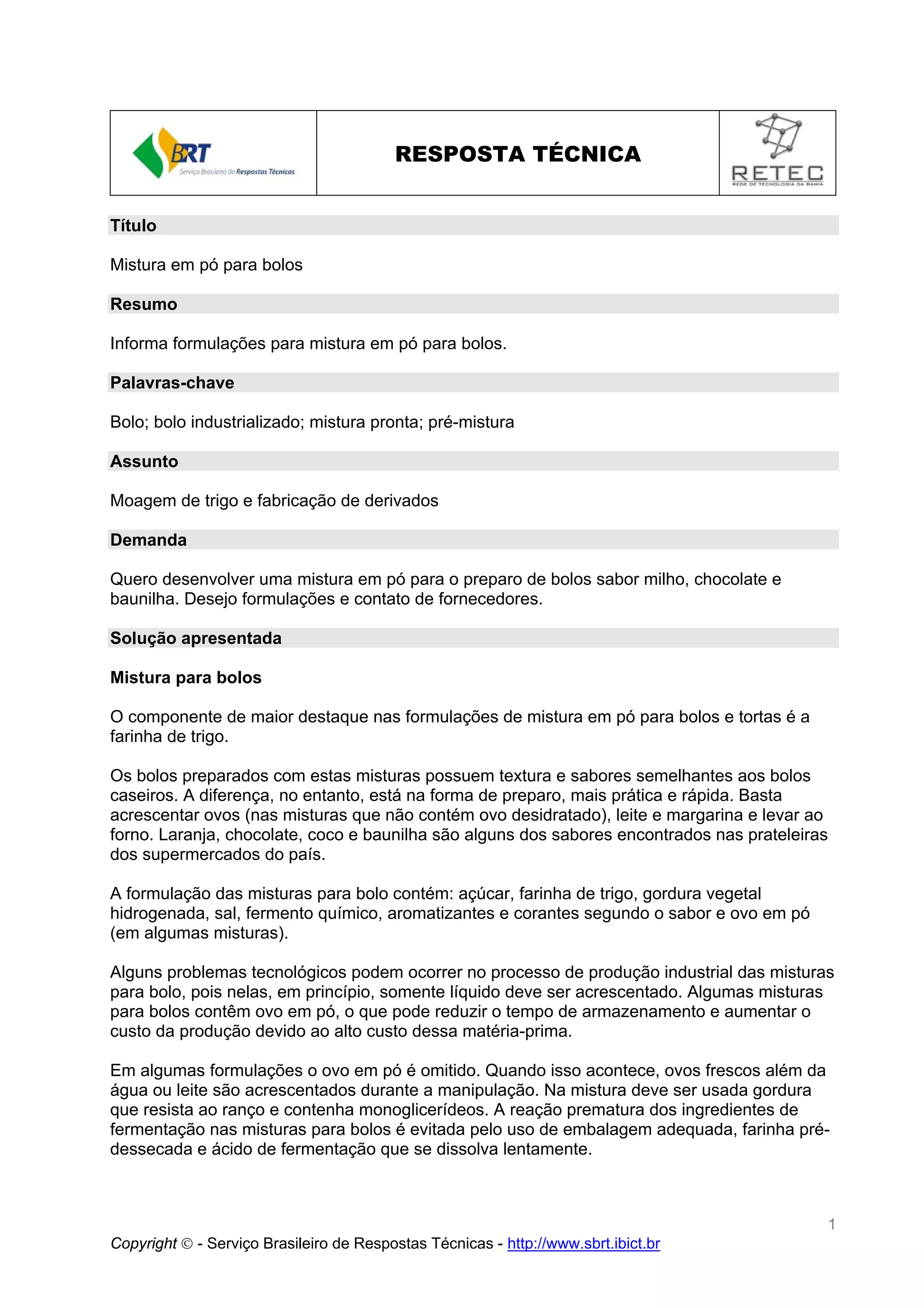 O documento fornece formulações e informações sobre ingredientes para o desenvolvimento de misturas em pó para bolos de diferentes sabores, incluindo uma mistura básica neutra e emulsificante para aerar o bolo. Contatos de fornecedores de ingredientes são também apresentados, assim como legislação e considerações sobre teste e produção das misturas.