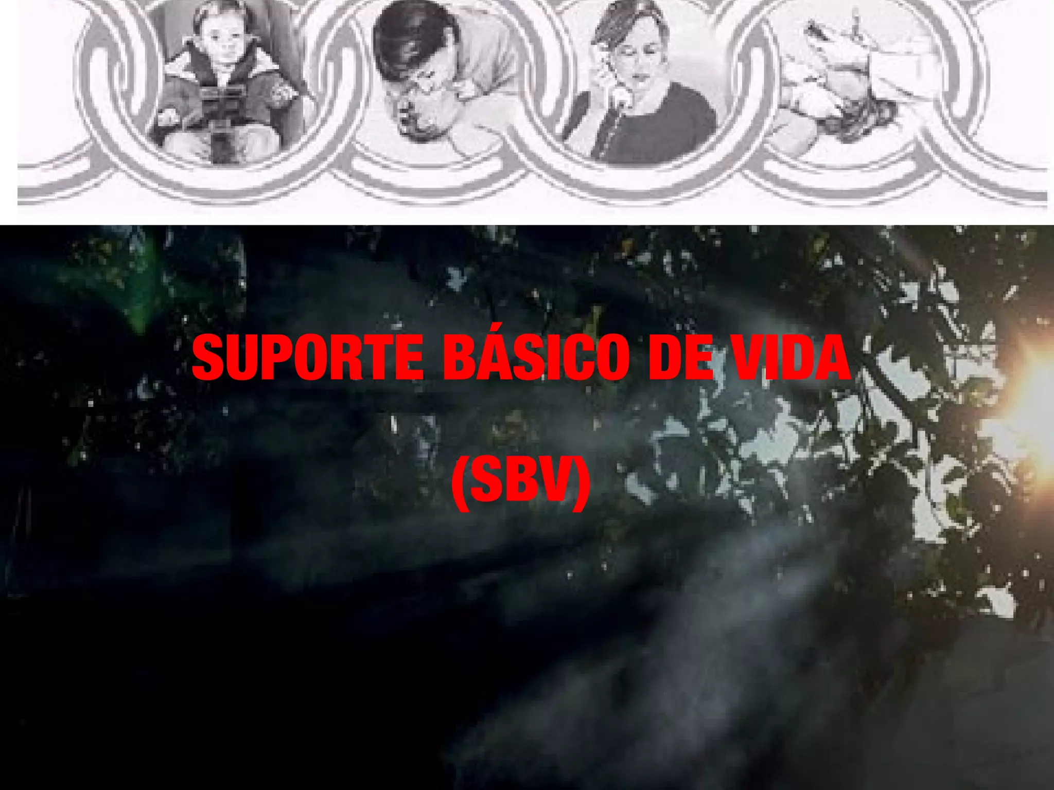 O documento discute Suporte Básico de Vida (SBV), abordando conceitos como Parada Cardiorrespiratória (PCR) e suas causas, medidas básicas como manobras de ressuscitação e desfibrilação, e algoritmos de atendimento de emergência.