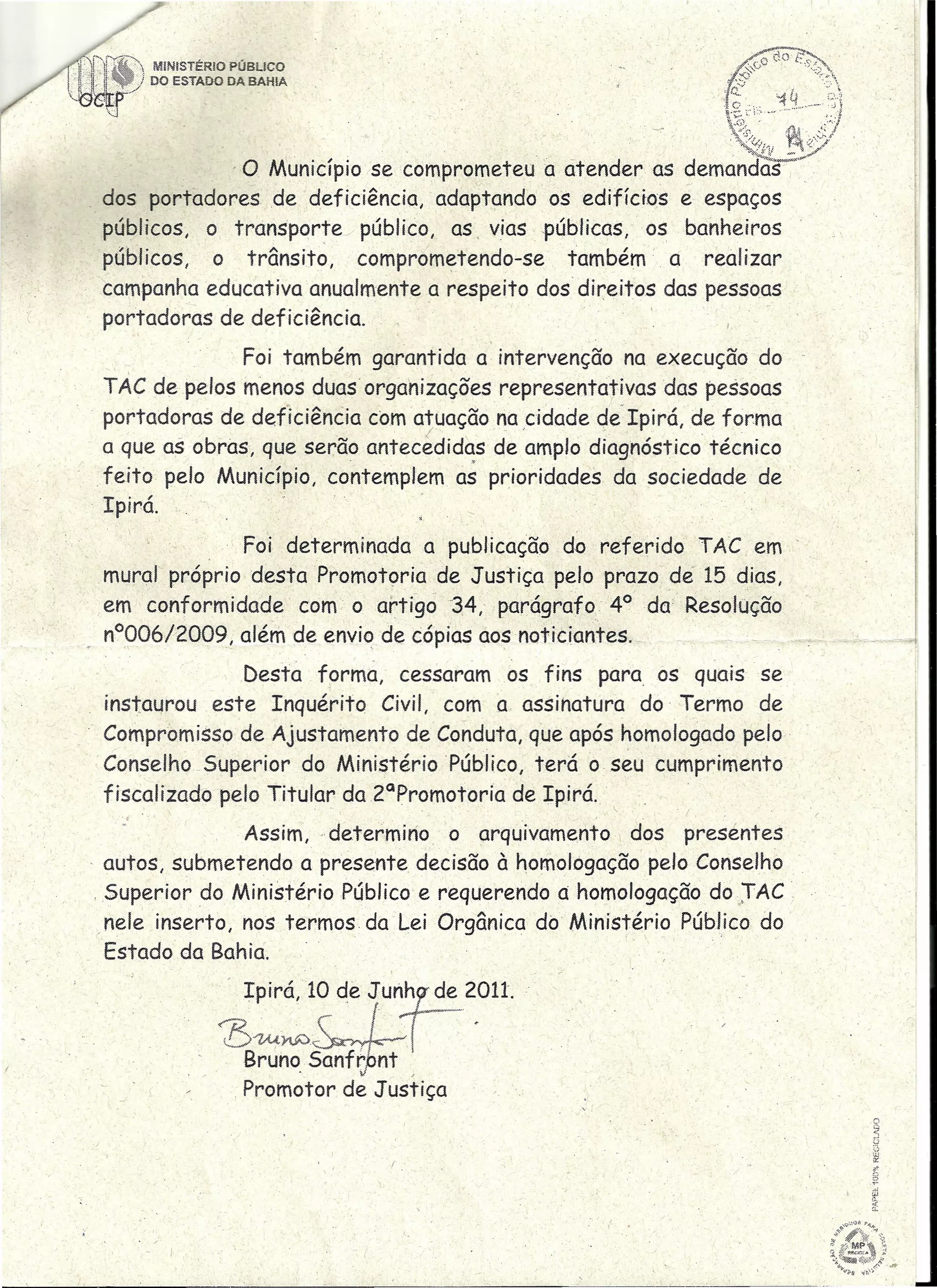 O município de Ipirá assinou um Termo de Compromisso de Ajustamento de Conduta (TAC) para promover a acessibilidade e inclusão das pessoas com deficiência. O TAC inclui adaptações de edifícios, transporte público e campanhas educativas. Duas organizações que representam pessoas com deficiência vão acompanhar a execução do TAC. Após a assinatura e homologação do TAC, o processo será arquivado.