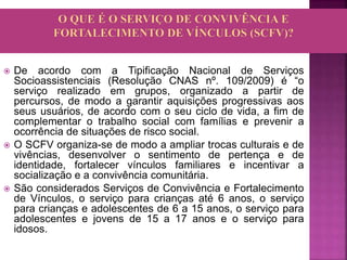 O documento descreve o Serviço de Convivência e Fortalecimento de Vínculos para Idosos definido na Tipificação Nacional de Serviços Socioassistenciais. O serviço tem como objetivos contribuir para o envelhecimento ativo e autônomo dos idosos, assegurar espaços de encontro e fortalecer vínculos familiares e comunitários. O serviço pode ser ofertado no CRAS ou em centros de convivência para idosos.
