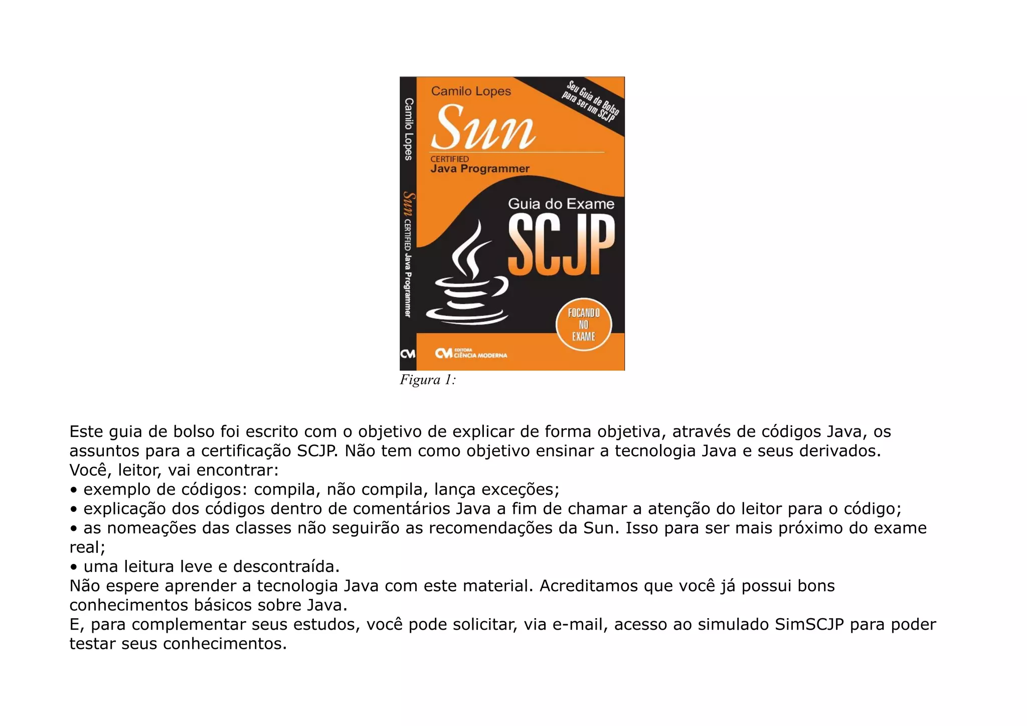 Este guia explica códigos Java para a certificação SCJP de forma objetiva através de exemplos curtos. O guia não tem como objetivo ensinar Java, mas sim fornecer explicações concisas de códigos para revisar conceitos chave da certificação. Leitores com conhecimento prévio de Java podem usar o guia para revisar tópicos do exame de forma leve.