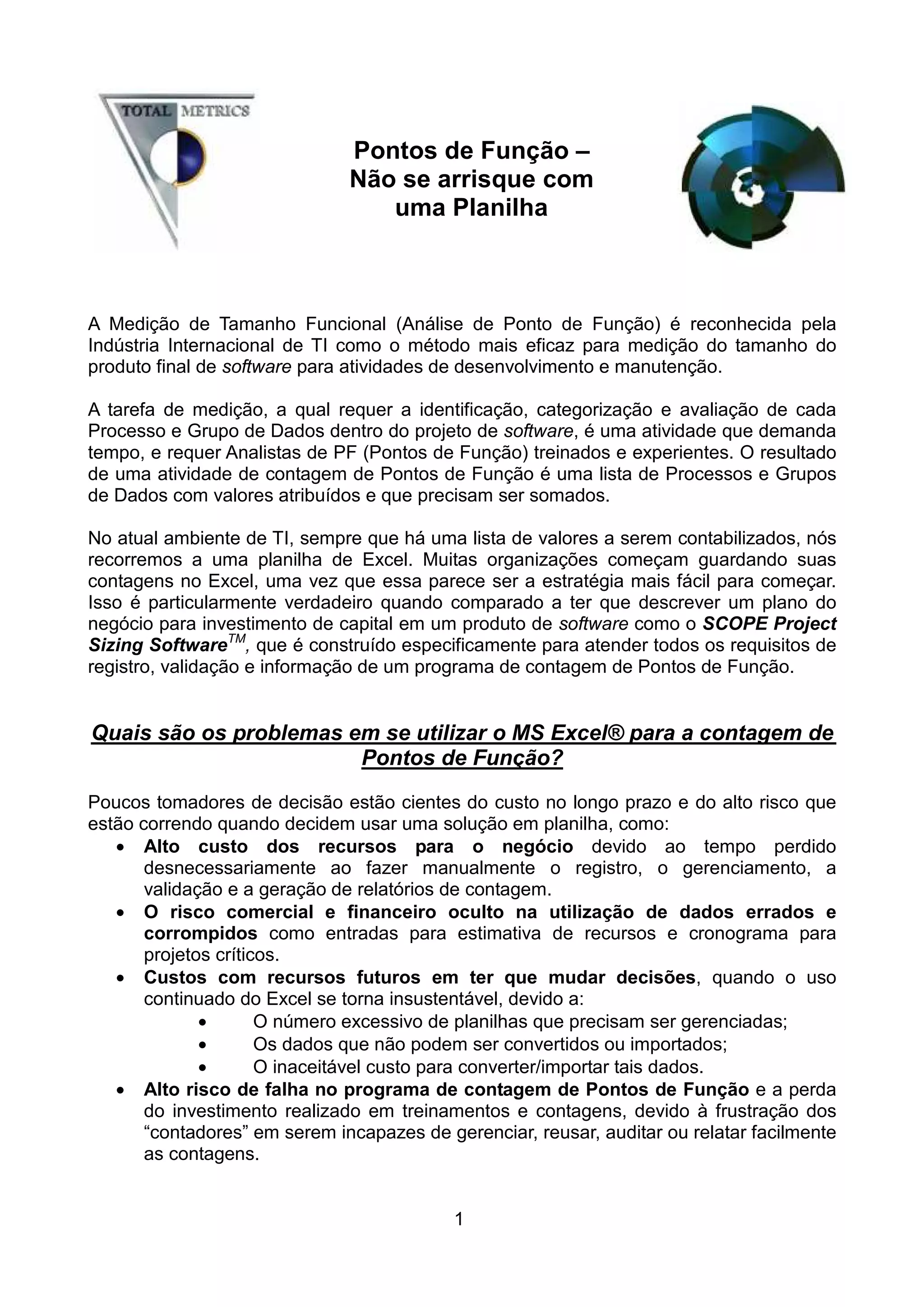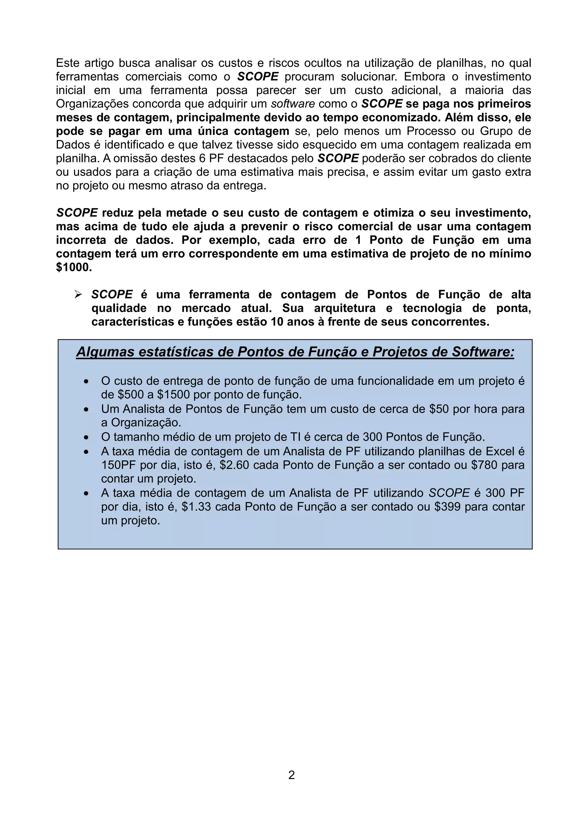 O documento analisa os riscos e custos ocultos associados ao uso de planilhas, como o Excel, para a contagem de pontos de função no desenvolvimento de software, destacando a importância de ferramentas especializadas como o Scope. O uso de planilhas pode resultar em perdas financeiras significativas e contagens incorretas devido a erros humanos e corrupção de dados, enquanto o Scope otimiza a contagem e reduz custos, além de melhorar a precisão e a rastreabilidade. A implementação do Scope é apresentada como uma solução eficiente que compensa rapidamente o investimento inicial através da economia de tempo e redução de riscos em projetos.