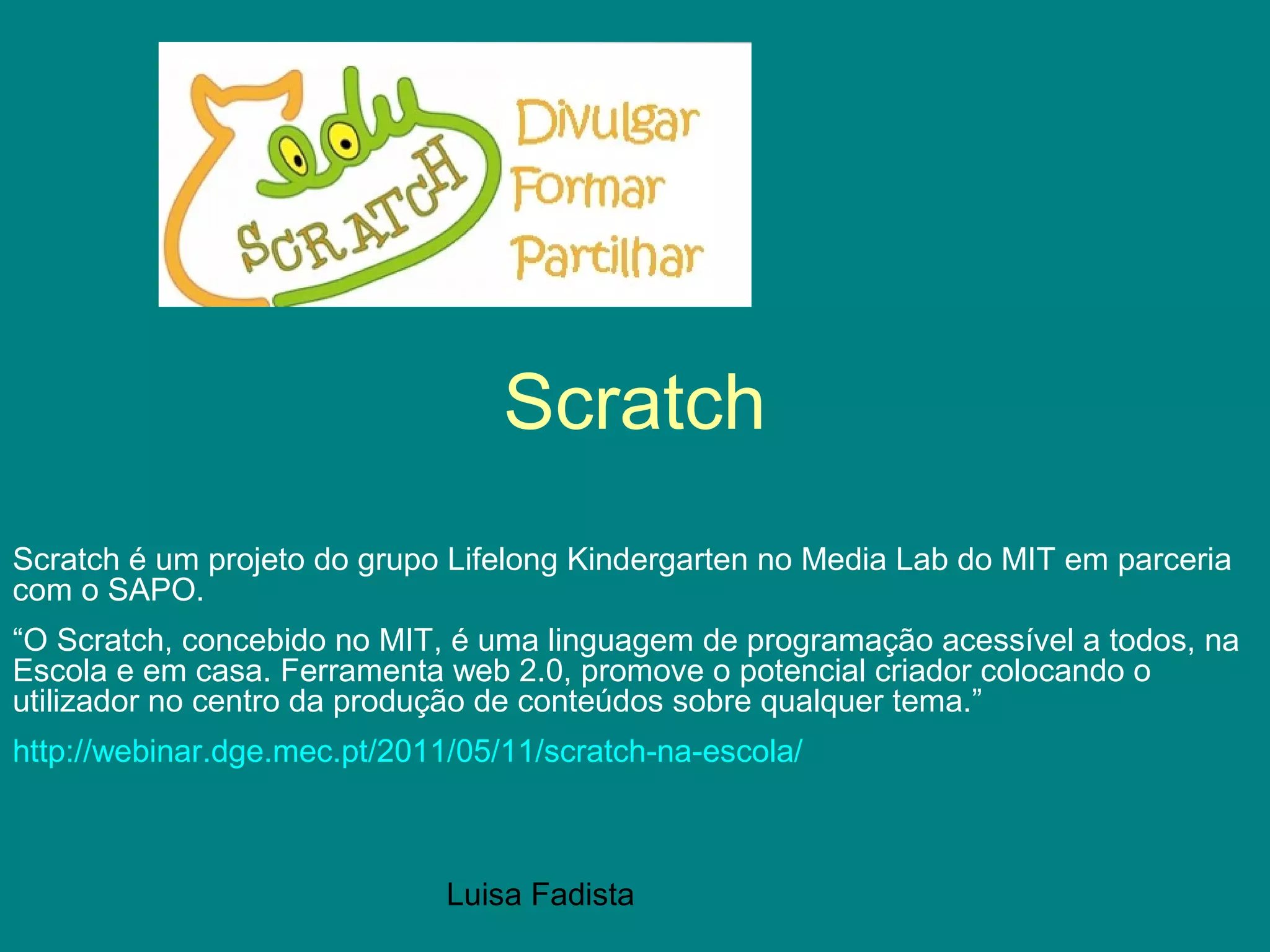Scratch é um projeto educacional de programação desenvolvido pelo MIT para crianças e jovens. É uma ferramenta online e gratuita que permite aos usuários criar histórias interativas, jogos e animações através de blocos visuais de programação. O Scratch promove a criatividade e resolução de problemas por meio da programação.