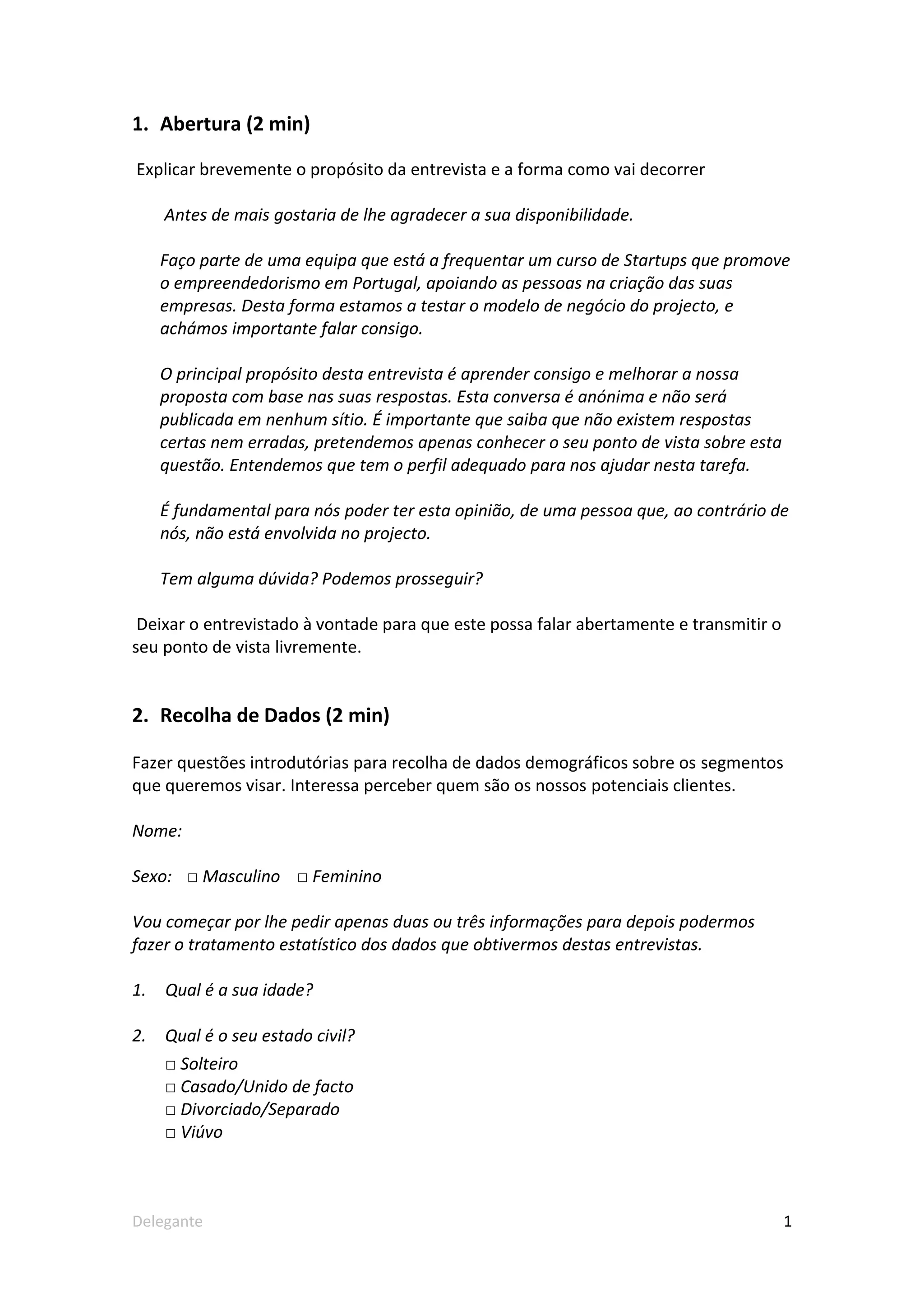 Este documento descreve um questionário para entrevistar potenciais clientes de um serviço de delegação de tarefas. O questionário coleta dados demográficos, explora quais tarefas o entrevistado já sentiu necessidade de delegar, e testa o interesse do entrevistado por uma plataforma online para contratar pessoas para realizar tarefas. O questionário termina pedindo feedback e contatos adicionais.