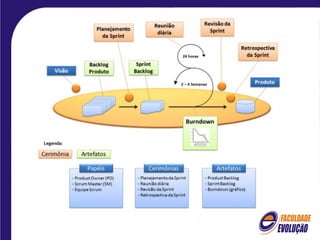 [1] O documento discute os princípios e práticas do framework Scrum para gerenciamento de projetos ágeis. [2] Scrum utiliza eventos curtos como Sprints, reuniões diárias e revisões para entregar valor incrementalmente ao cliente. [3] Os papéis no Scrum incluem Product Owner, Time de Desenvolvimento e Scrum Master.