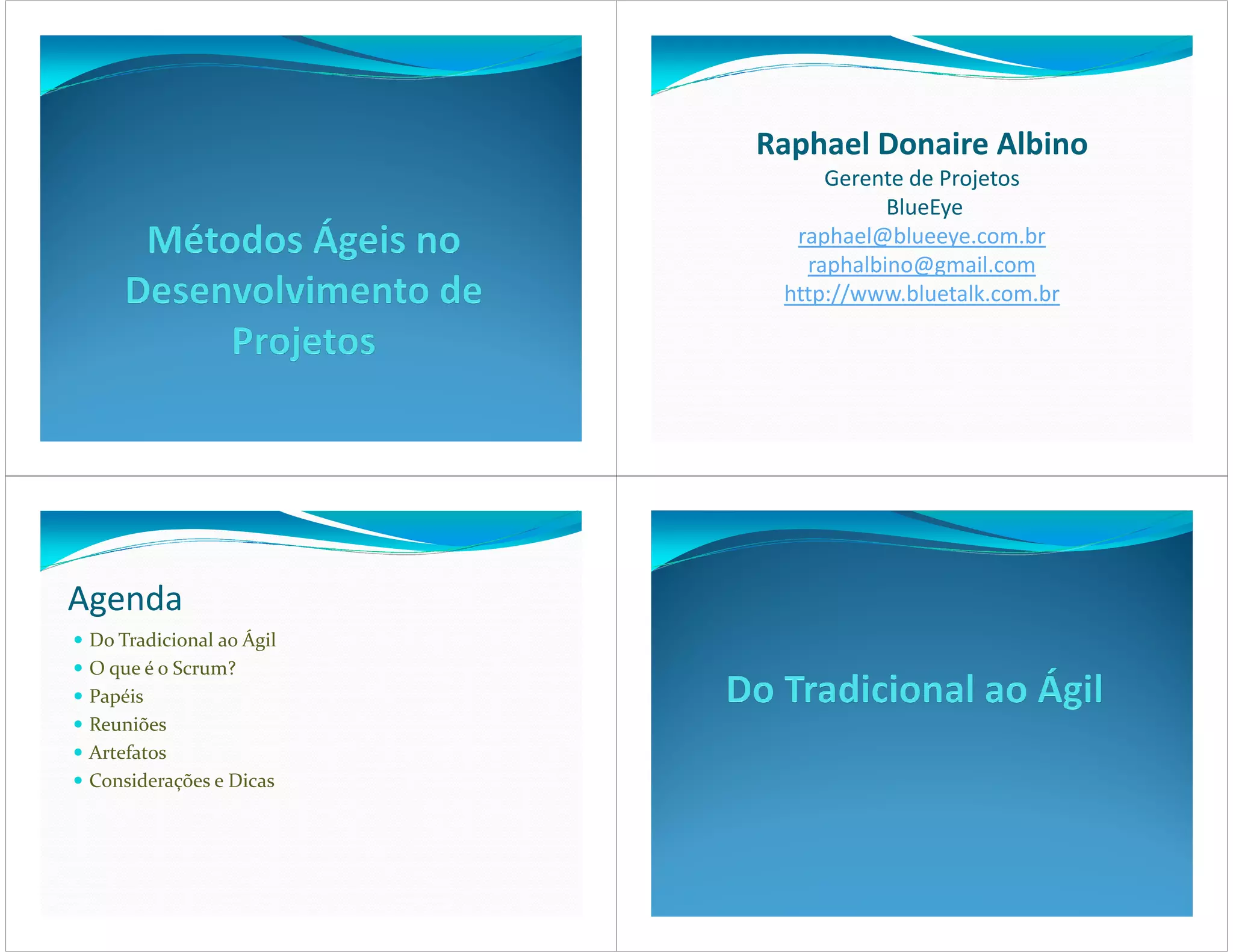O documento fornece uma introdução ao framework Scrum, descrevendo seus principais conceitos e práticas como: valores ágeis, papéis como Product Owner e Scrum Master, artefatos como Product Backlog e Sprint Backlog, e reuniões como Sprint Planning e Daily Scrum. O documento também discute os benefícios do Scrum ao mudar de uma abordagem de planejamento tradicional para uma abordagem ágil e iterativa.