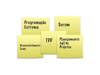 O documento discute vários métodos de desenvolvimento de software, como o desenvolvimento linear tradicional, desenvolvimento incremental e Agile. Apresenta os princípios do Manifesto Ágil e do framework Scrum, incluindo papéis, cerimoniais e artefatos. Defende a importância de testes automatizados e entrega contínua de valor para o cliente.