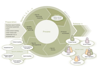 Este documento apresenta uma introdução à gestão ágil de projetos com SCRUM. Resume as principais características de metodologias ágeis como o Manifesto Ágil, Unified Process, SCRUM e eXtreme Programming. Também descreve conceitos como papéis, artefatos e cerimônias de SCRUM, além de práticas ágeis comuns.