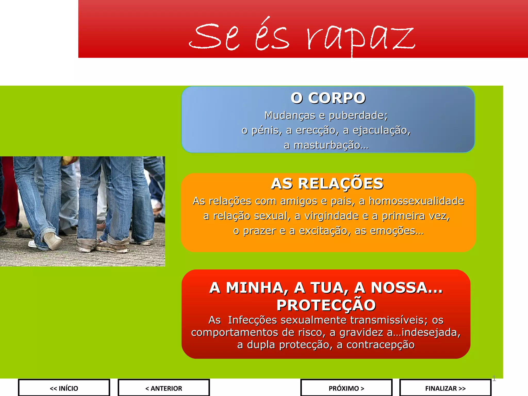 O documento discute tópicos relacionados à puberdade masculina, incluindo mudanças físicas, relações sociais, sexualidade e saúde reprodutiva. Aborda temas como desenvolvimento dos órgãos genitais, ereção, ejaculação, masturbação, relacionamentos, atração por pessoas do mesmo sexo e relações sexuais seguras.