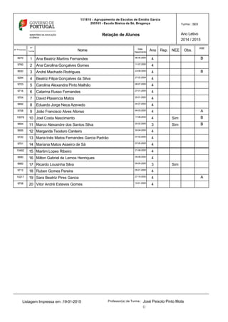Este documento fornece uma lista de 20 alunos matriculados em uma turma da escola básica da Sé, em Bragança, Portugal. A lista inclui o nome, data de nascimento e observações de cada aluno, como a turma ou necessidades educativas especiais a que pertencem.