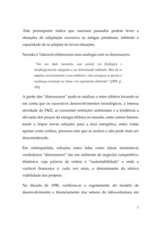 O documento discute a expansão do setor elétrico brasileiro com inovação tecnológica. Apresenta como o setor conseguiu estruturar um sistema único de geração e transmissão de energia hidrelétrica em larga escala. No entanto, argumenta que o setor precisa buscar novas alternativas para atender à crescente demanda por energia, como incentivar práticas mais eficientes e diversificar a matriz energética para além da hidroeletricidade.