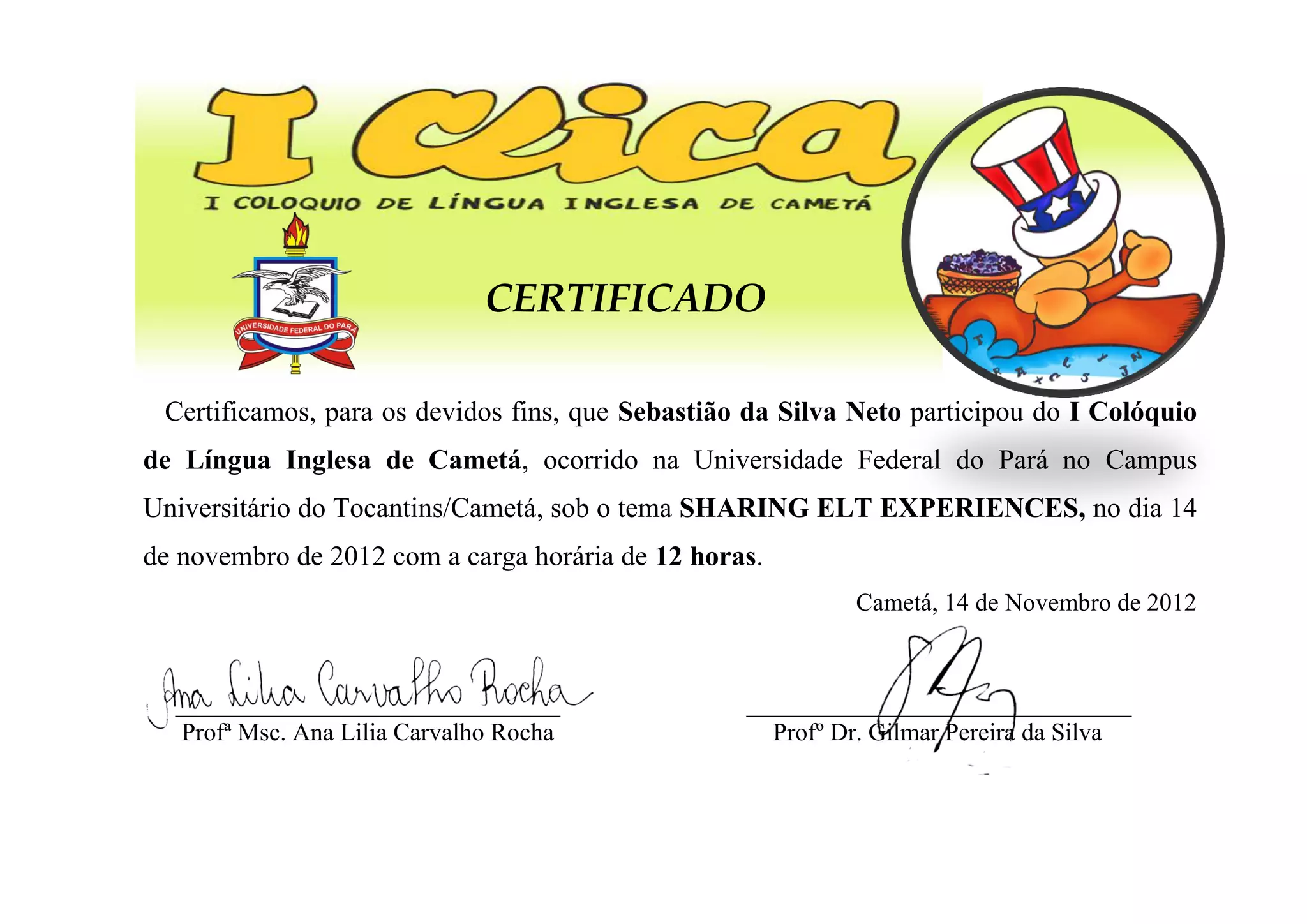 Este certificado confirma que Sebastião da Silva Neto participou do primeiro colóquio de língua inglesa de Cametá na Universidade Federal do Pará em 14 de novembro de 2012, com 12 horas de duração sobre compartilhando experiências de ensino de inglês.