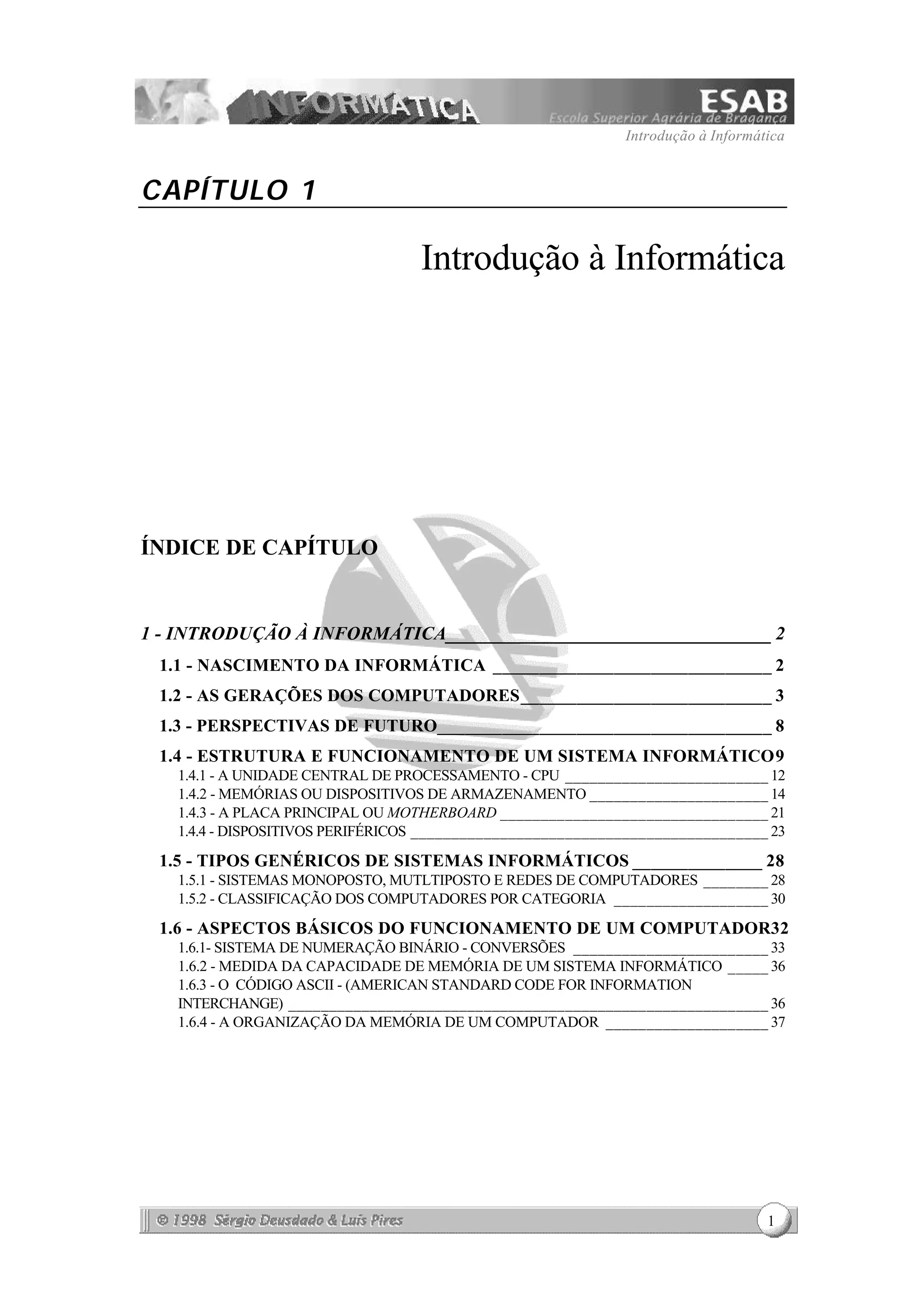 O documento introduz conceitos básicos sobre informática, descrevendo: 1) as gerações de computadores desde a 1a geração com válvulas até a atual de microprocessadores; 2) a estrutura básica de um sistema informático, incluindo a unidade central de processamento, memórias, placa-mãe e periféricos; 3) tipos de sistemas como monousuário, rede e classificações de computadores.