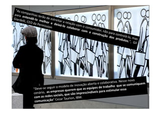 O documento discute a palestra de Moysés Simantob sobre inovação tecnológica. Simantob abordou: (1) os desafios da inovação aberta, como curiosidade, confiança e colaboração; (2) a evolução da Web de 1.0 a 3.0 e como a Geração Y impulsiona a inovação; (3) exemplos de como empresas usam redes sociais para inovar.