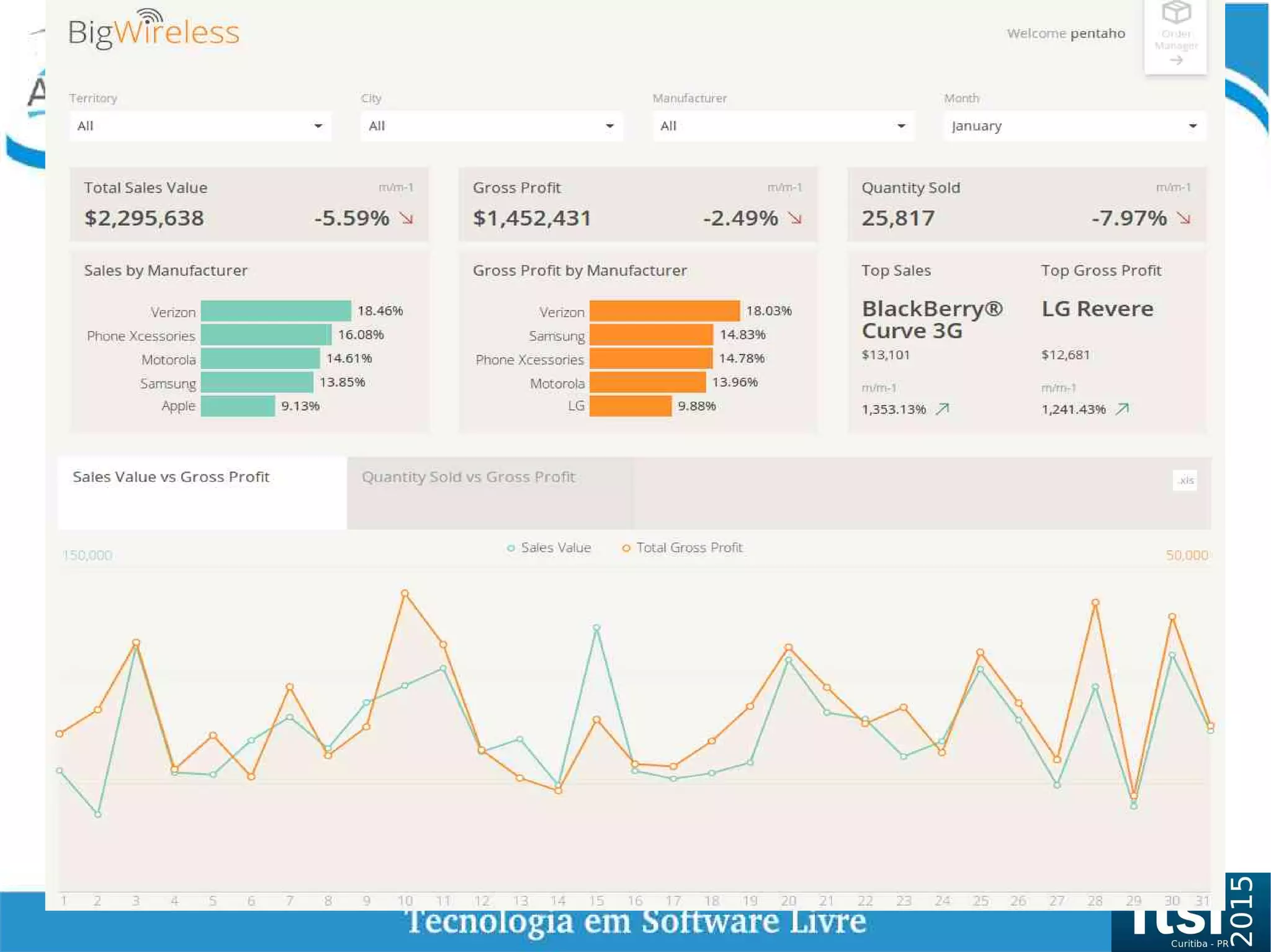 Marcio Junior Vieira apresenta sobre inteligência empresarial com soluções de software livre como CRM (SugarCRM), ECM (Alfresco), BPM (Activiti) e BI (Pentaho). Ele discute como essas ferramentas podem integrar dados, processos e tomada de decisão para melhorar a gestão e competitividade de negócios. Marcio também fornece detalhes sobre sua empresa Ambiente Livre e como ela oferece serviços em software livre.