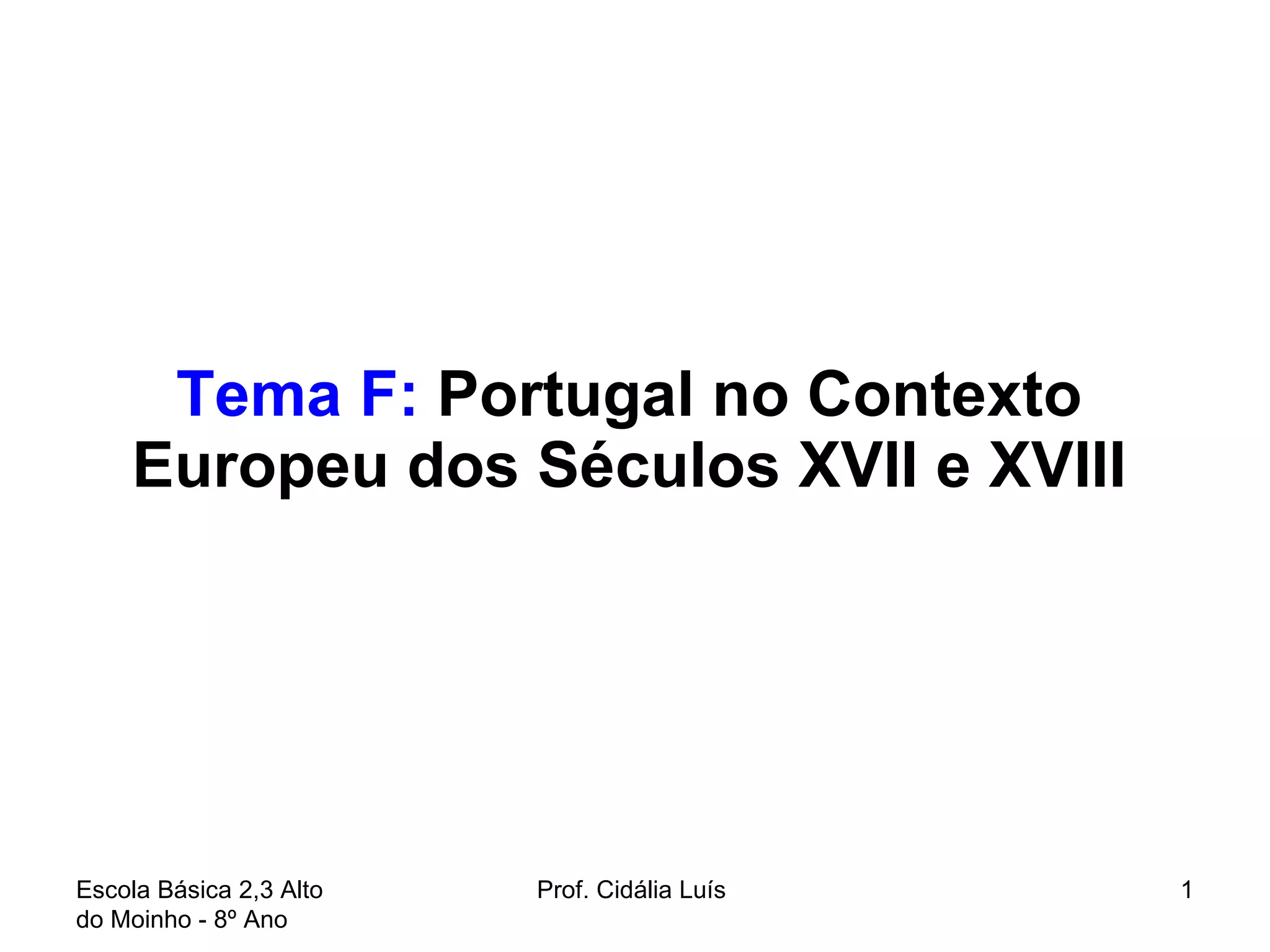 Tema F: Portugal no Contexto Europeu dos Séculos XVII e XVIII Escola Básica 2,3 Alto do Moinho - 8º Ano Prof. Cidália Luís