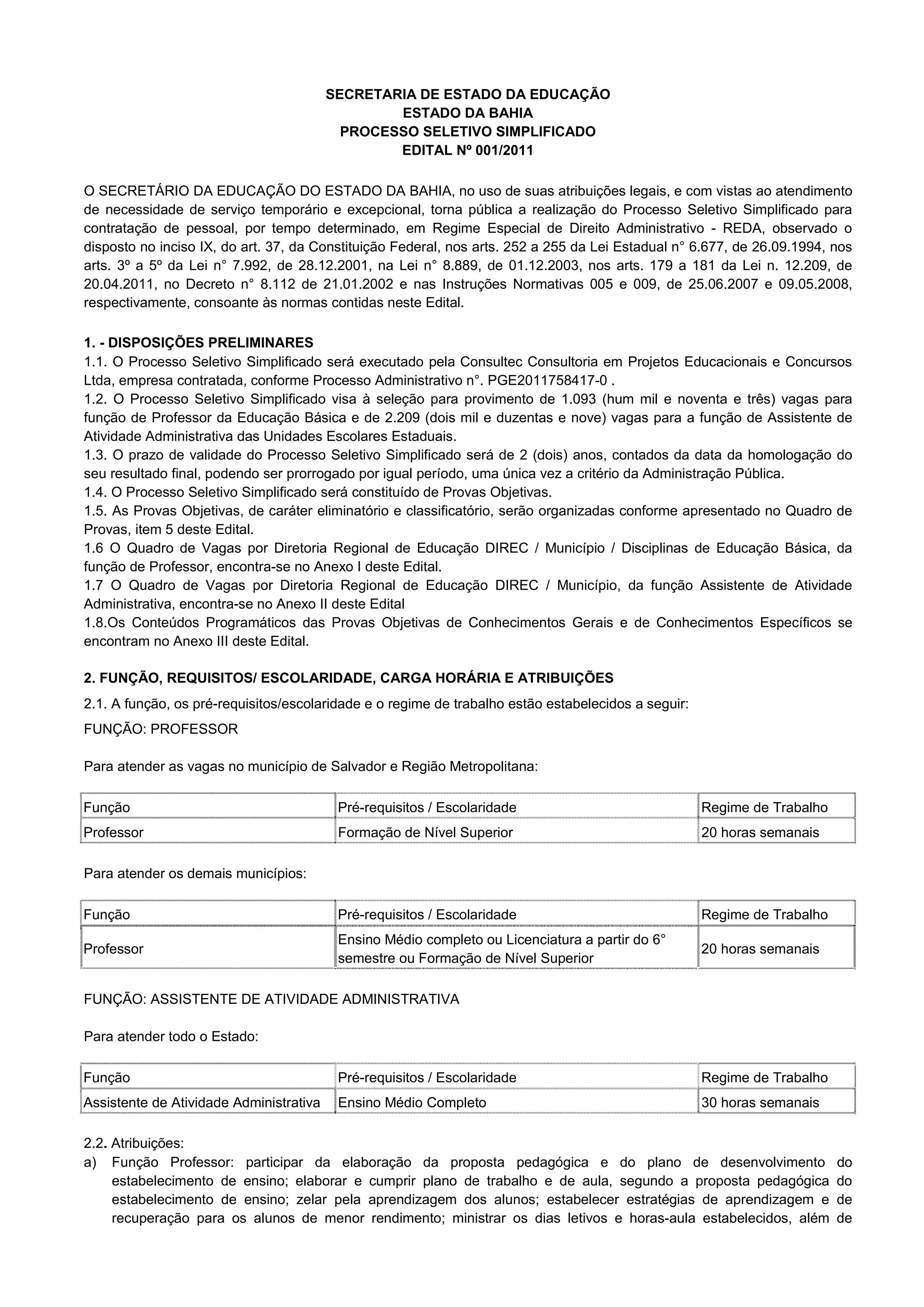 1. O documento anuncia um processo seletivo simplificado para contratação temporária de professores e assistentes administrativos para escolas estaduais na Bahia. Serão oferecidas 1.093 vagas para professores e 2.209 vagas para assistentes.