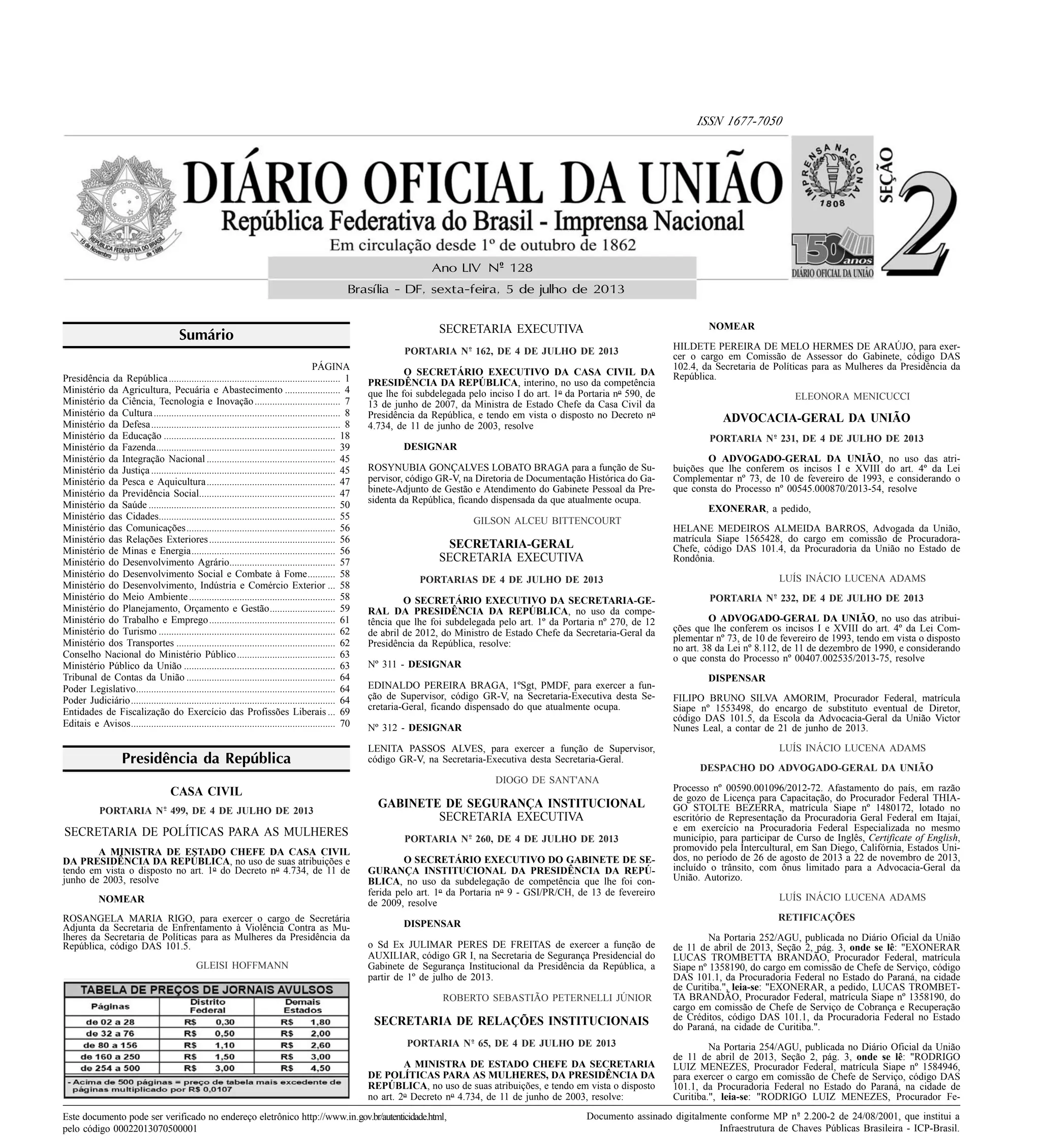 1) O documento é um diário oficial do governo brasileiro que lista nomeações, exonerações e outros atos de vários ministérios e órgãos federais em 5 de julho de 2013.