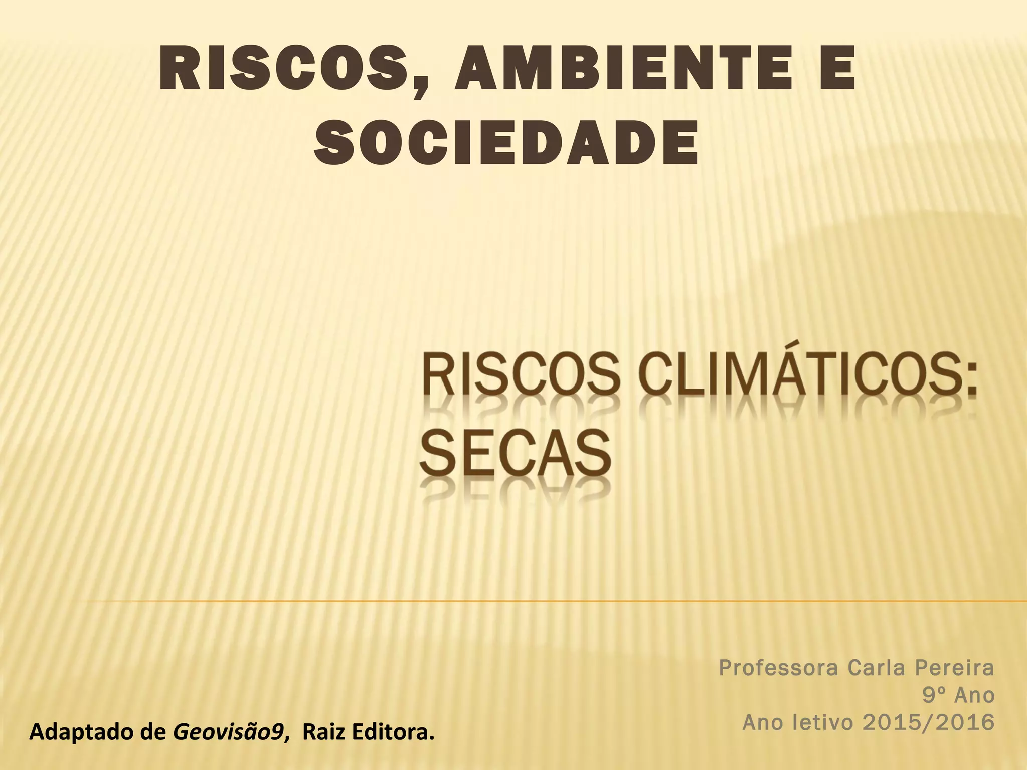O documento discute os riscos ambientais e sociais das secas. Define seca como um fenômeno climático caracterizado por défice de umidade no solo devido à falta de chuva por longos períodos. Detalha dois tipos de seca e suas causas, efeitos negativos das secas incluindo perdas agrícolas e degradação da qualidade da água, e regiões mais vulneráveis a secas em Portugal.