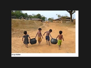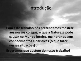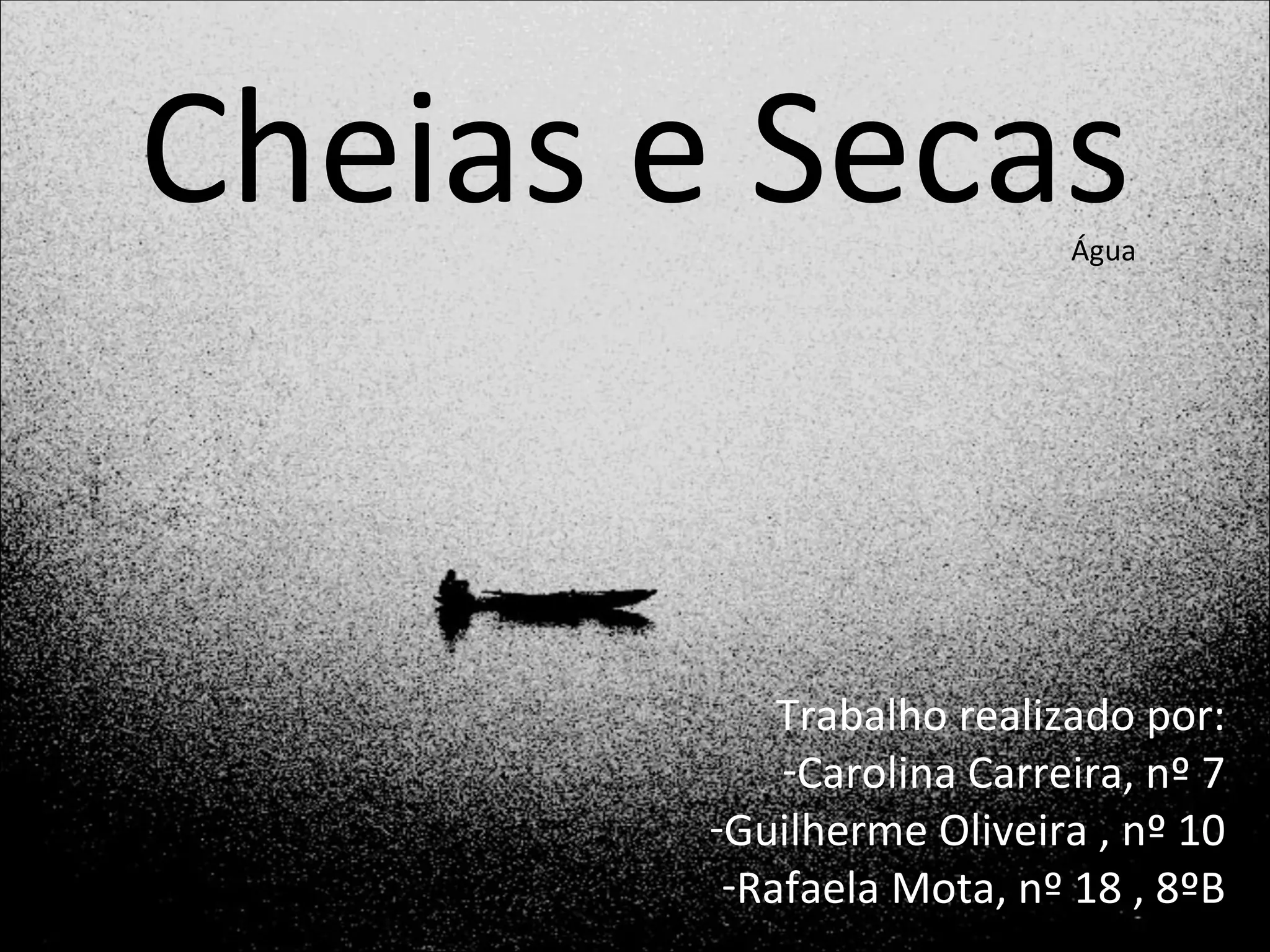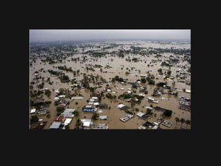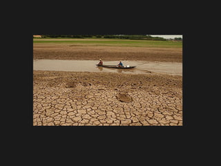 O documento discute cheias e secas, suas causas naturais e artificiais como urbanização, desmatamento e aquecimento global, além de suas consequências como perda de vidas e danos econômicos. Ele também fornece dicas de como agir durante esses eventos e inclui curiosidades sobre deuses associados a rios e secas.