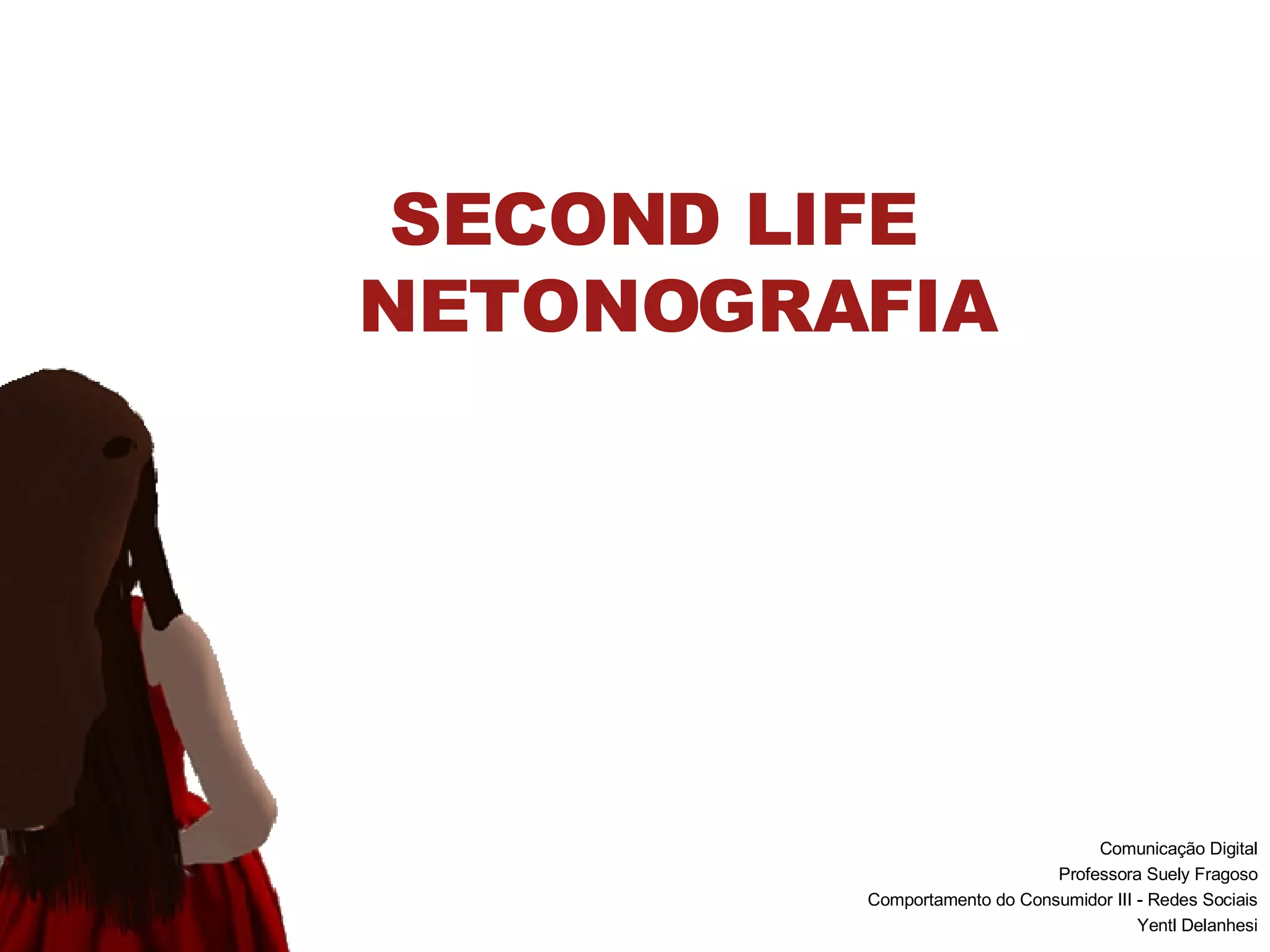 O documento descreve uma netnografia realizada no jogo online Second Life, onde a pesquisadora assumiu a identidade de um avatar para observar e interagir com outros usuários. Ela relata suas percepções iniciais do jogo versus a experiência real, destacando aspectos como a imersão no ambiente virtual, as interações sociais e a compreensão das normas e linguagens próprias do Second Life.