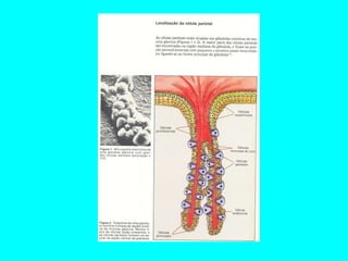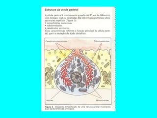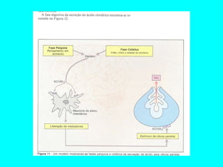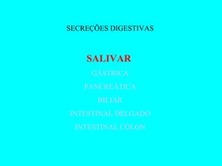 1) O documento descreve as principais secreções digestivas do trato gastrointestinal, incluindo salivar, gástrica, pancreática, biliar e intestinal.
