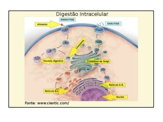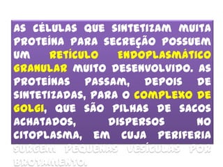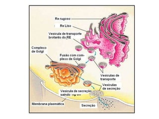 As células que produzem muitas proteínas possuem um retículo endoplasmático granular desenvolvido. As proteínas sintetizadas passam pelo complexo de Golgi, que dispersa pequenas vesículas no citoplasma. O acrossomo é uma vesícula de enzimas sintetizada pelo Golgi para digerir a zona pelúcida do óvulo.